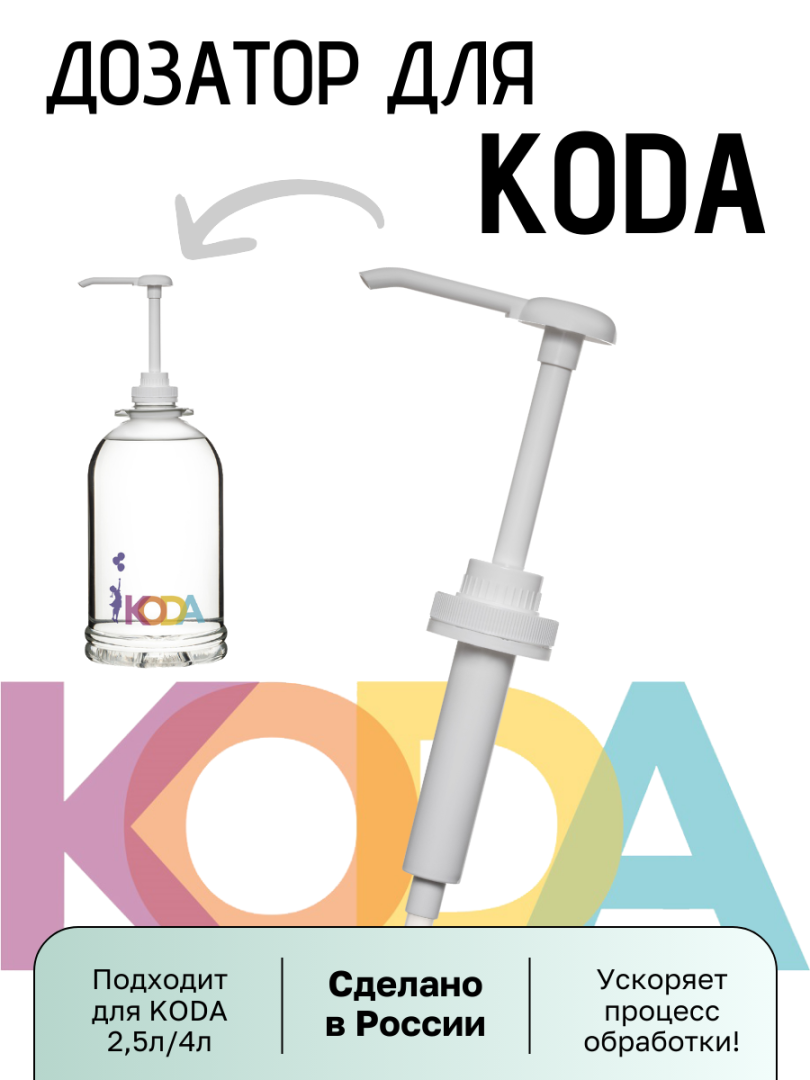 Данный дозатор подходит для бутылок со средством для обработки KODA объёмом 2,5 и 4 л (Артикулы 1302-1321 и 1302-1322). Также подходит и для ёмкости с HiFloat артикул 1302-0064 Хай-флоат ультра 0,71л и артикул 1302-0065 Хай-флоат ультра 2,84л.