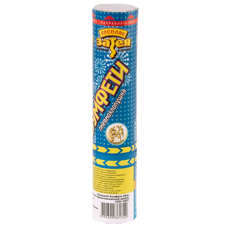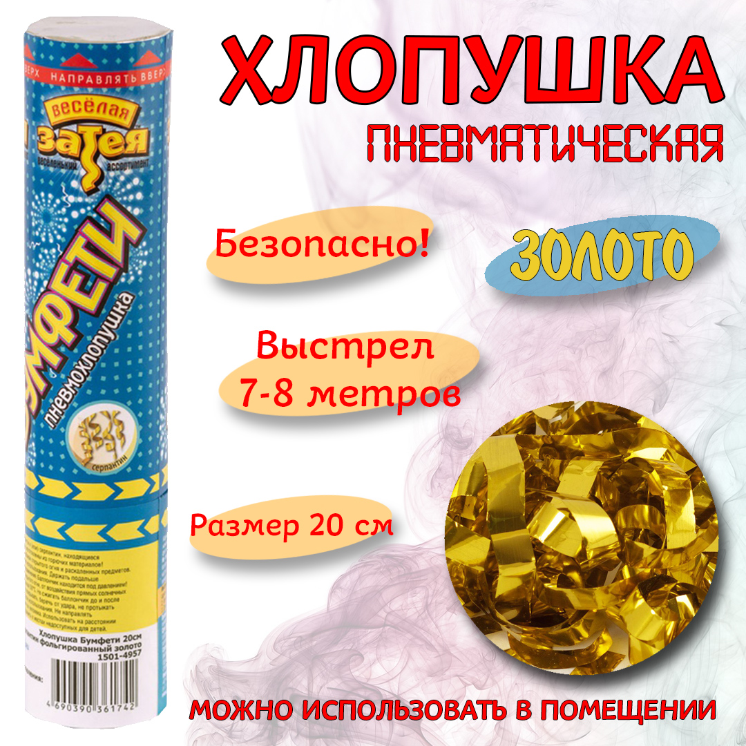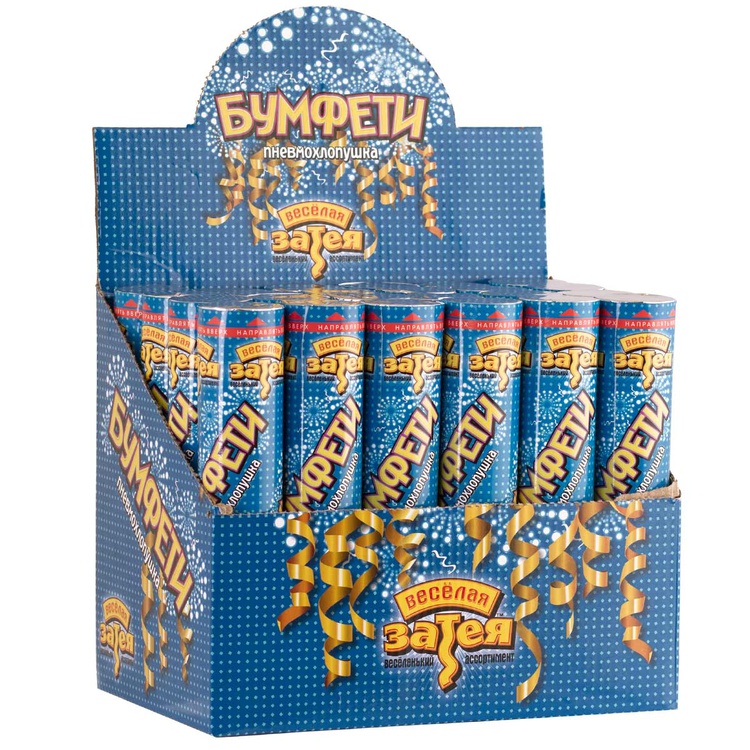 Пневматическое устройство, аналог хлопушки, абсолютно безопасное, предназначено для использования в помещении и на улице, дальность выстрела 6-8 м.Корпус хлопушки состоит из двух частей: пневматического баллона со сжатым воздухом и картонного цилиндра с наполнителем. Баллон изготовлен из металла, надежен и безопасен при хранении и в использовании, обладает высокой прочностью, чтобы выдержать давление воздуха.