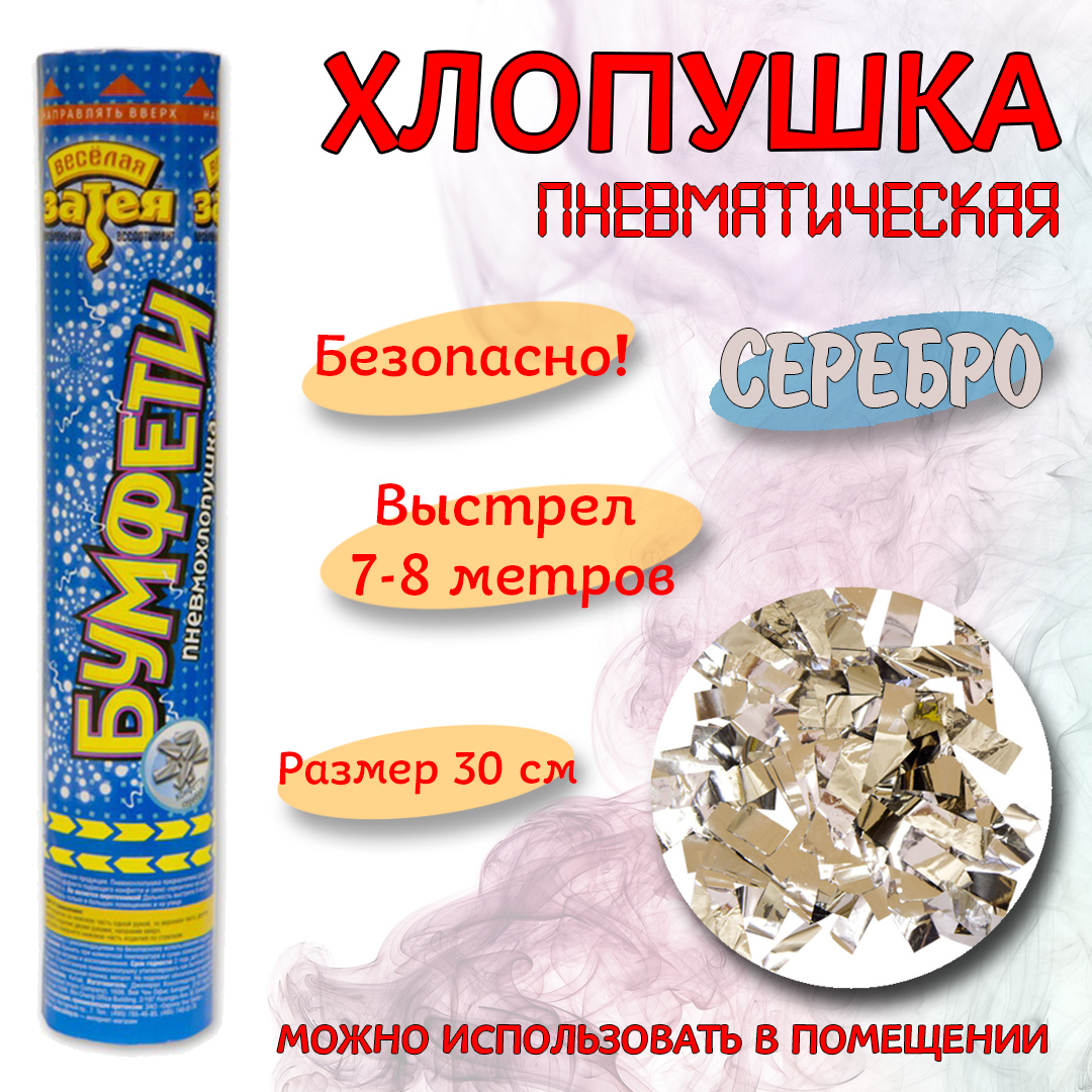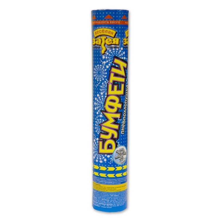 Пневматическое устройство, аналог хлопушки, абсолютно безопасное, предназначено для использования в помещении и на улице, дальность выстрела 6-8 м.Корпус хлопушки состоит из двух частей: пневматического баллона со сжатым воздухом и картонного цилиндра с наполнителем. Баллон изготовлен из металла, надежен и безопасен при хранении и в использовании, обладает высокой прочностью, чтобы выдержать давление воздуха.