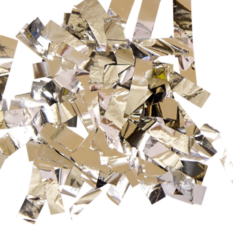 Выстреливает конфетти из золотой фольгированной бумаги.