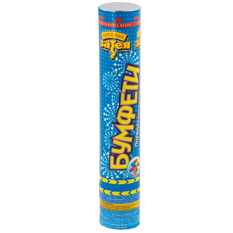 Пневматическое устройство, абсолютно безопасное, предназначено для использования в помещении и на улице, дальность выстрела 6-8 м.Корпус хлопушки состоит из двух частей: пневматического баллона со сжатым воздухом и картонного цилиндра с наполнителем. Баллон изготовлен из металла, надежен и безопасен при хранении и в использовании, обладает высокой прочностью, чтобы выдержать давление воздуха.