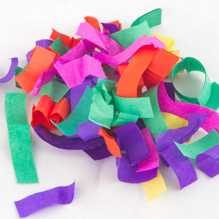 Выстреливает конфетти из разноцветной бумаги.