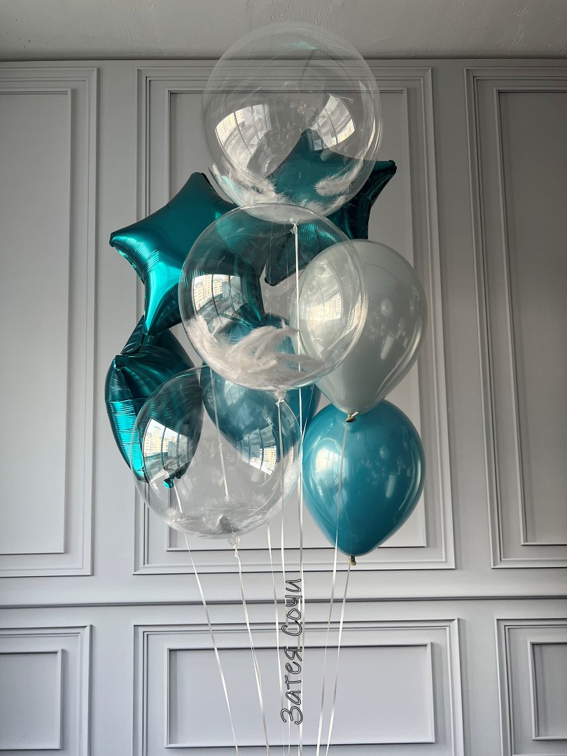 Закажите набор — и подарите себе или близким праздник, который запомнится! Пусть торжество станет таким же свежим, ярким и воздушным, как бирюзовый фонтан из шаров с звёздами и перьями.