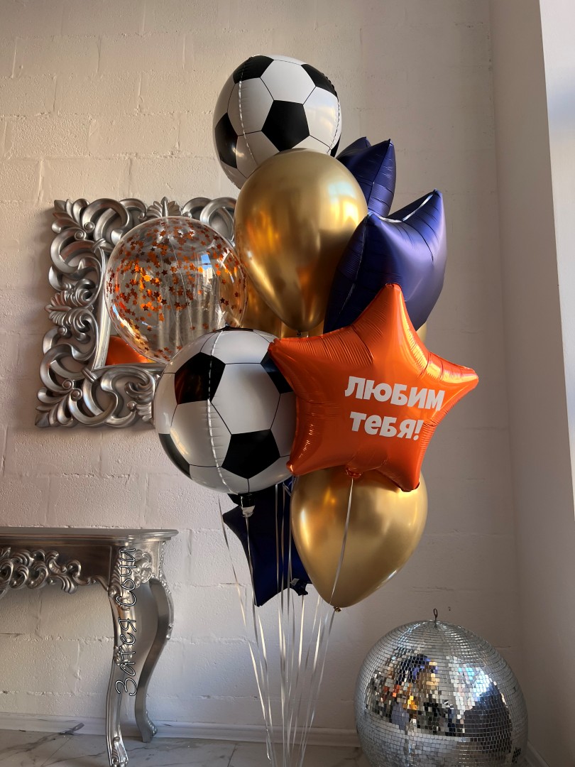 Набор «Фонтан из шаров „Футбол“» — праздник как финальный матч чемпионата!Надоело обычное украшение? Наш фонтан — будто гол в последние секунды: эффектный, яркий и с вау‑эффектом! Синий, золото и оранжевый создают драйв стадиона, фольга блестит как кубок победителя, а прозрачные шары с конфетти взрываются, как фанфары!