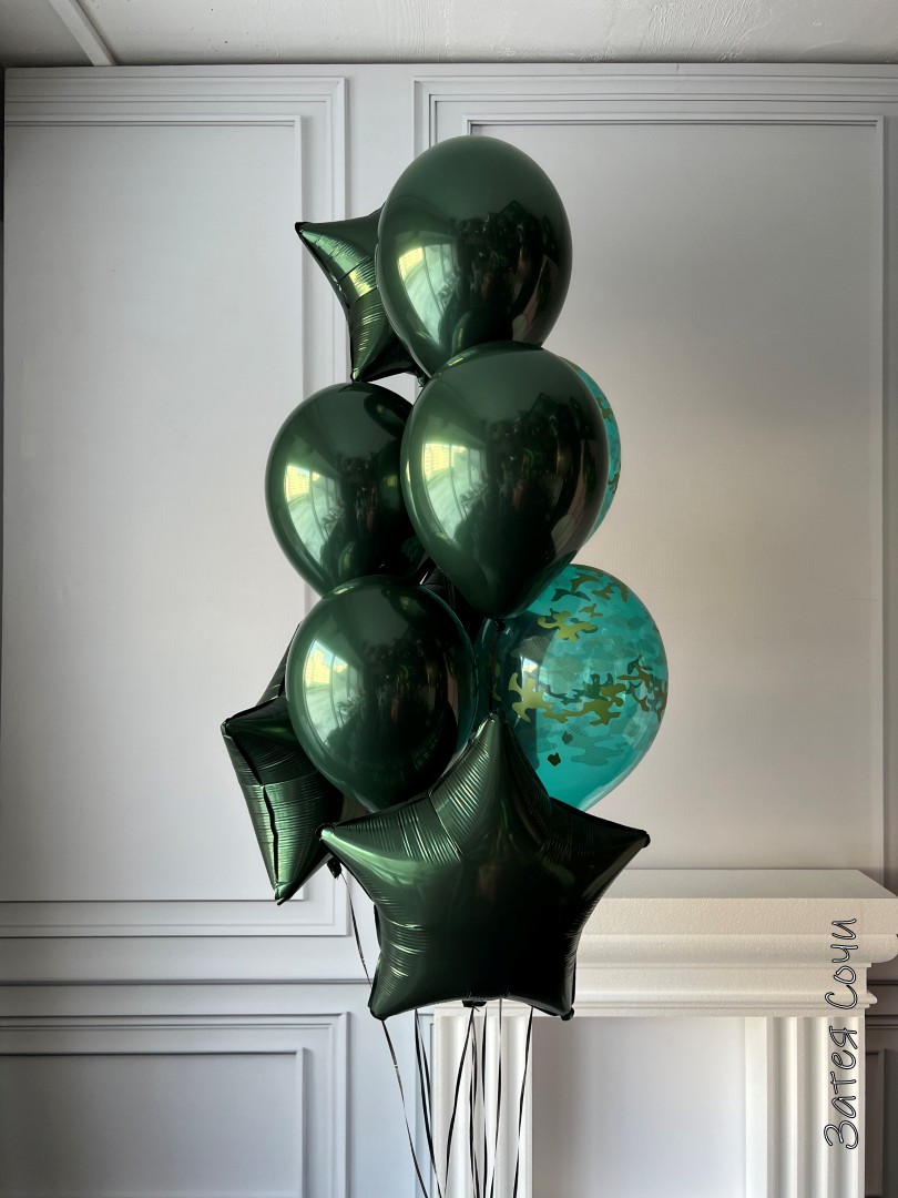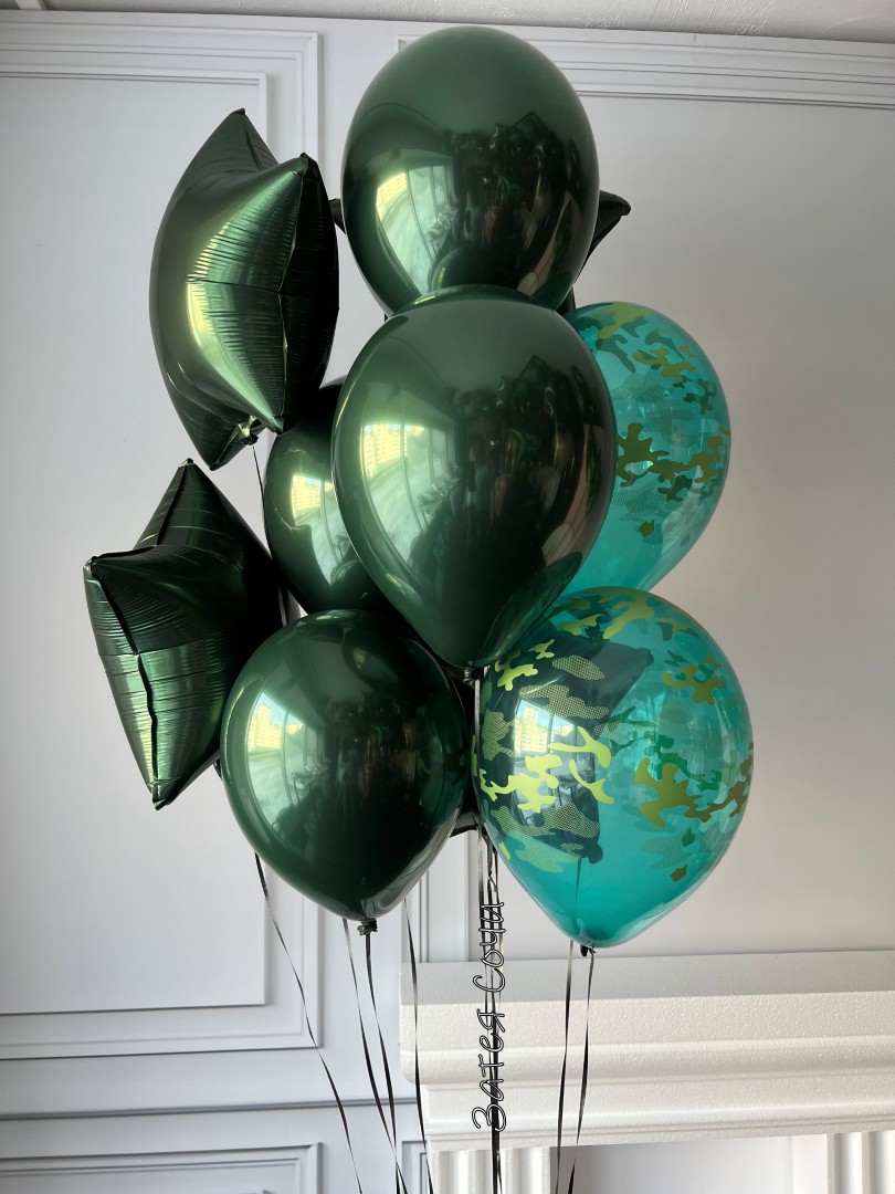 латексные и фольгированные шары в камуфляжном и зелёном оттенках.