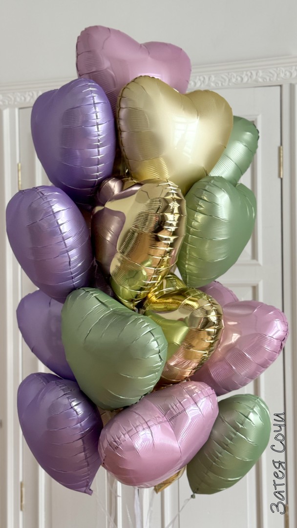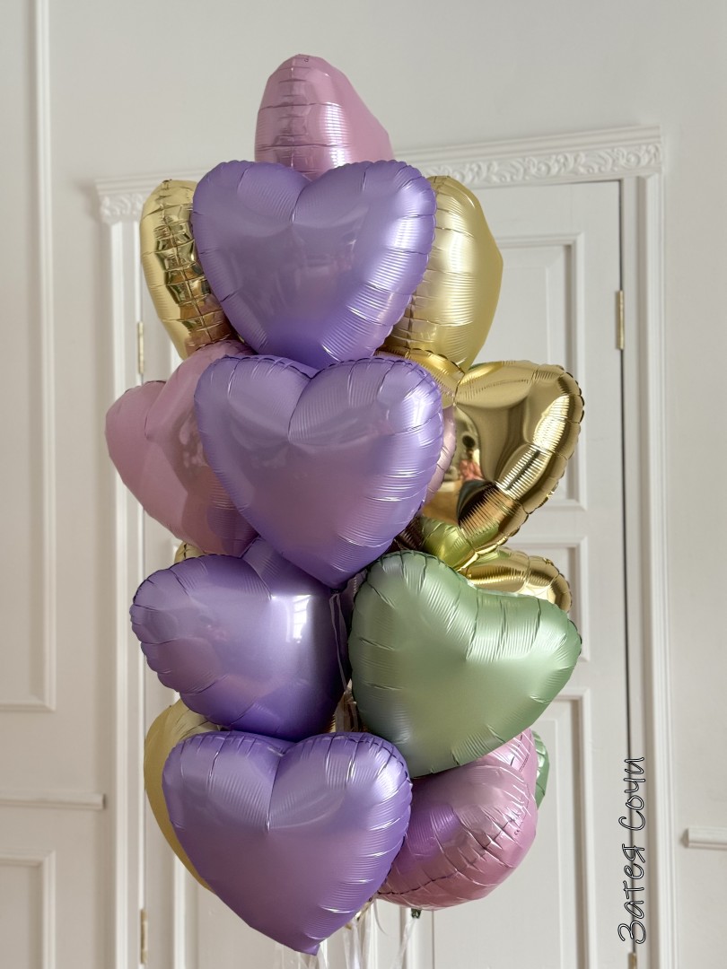 16 шаров‑сердец в изысканной пастельной гамме (лаванда, мята, розовый, золотой);