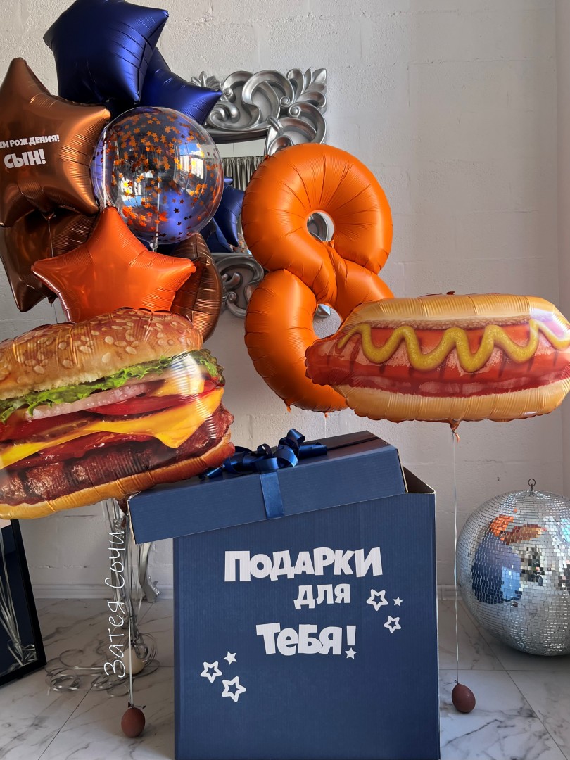 Коробка украшена тематическими наклейками и нейтральным бантом. Шары наполнены чистым гелием. Размер коробки 70х70х70 см.