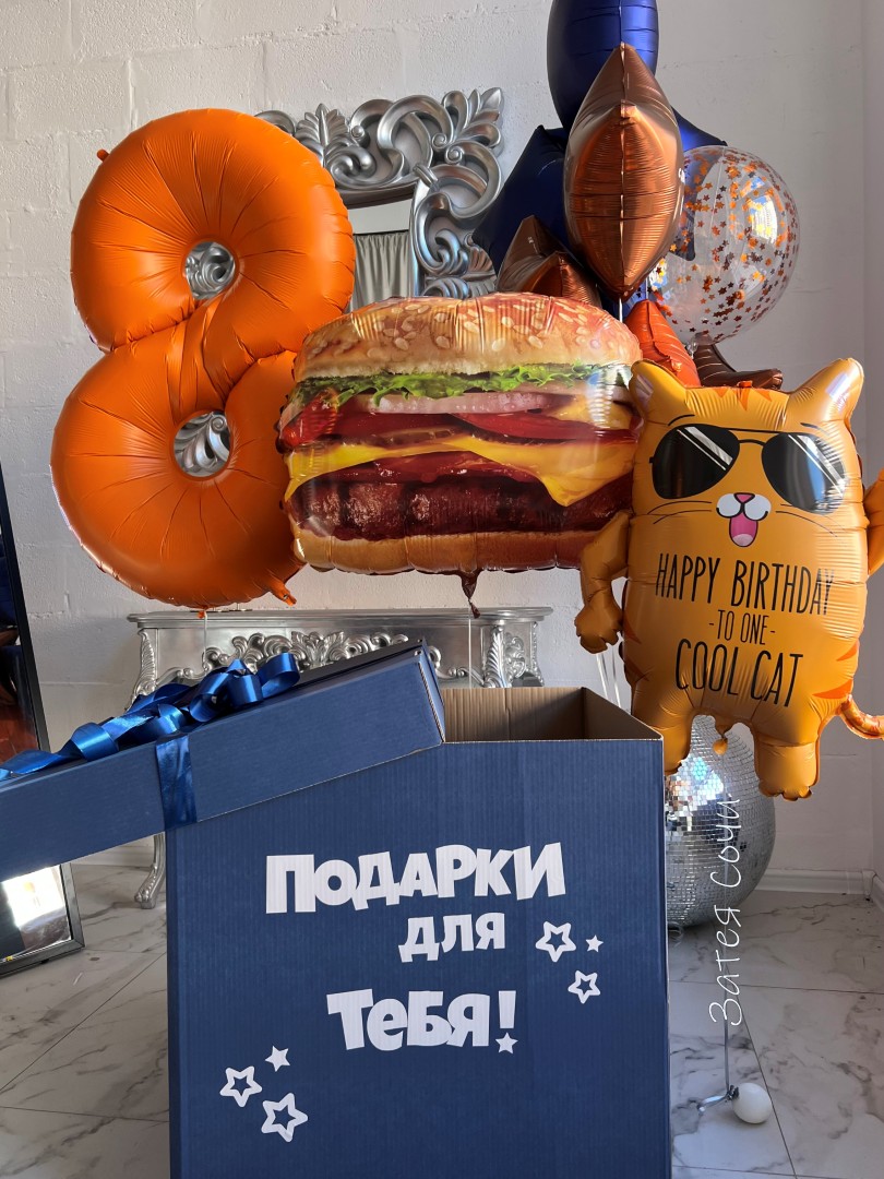 Коробка украшена тематическими наклейками и нейтральным бантом. Шары наполнены чистым гелием. Размер коробки 70х70х70 см.