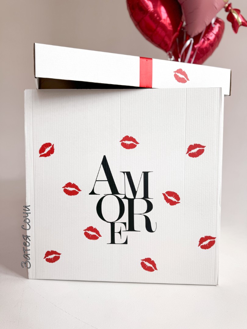 стильная белая коробка с красным бантом и надписью «Amore» с мотивами поцелуев;