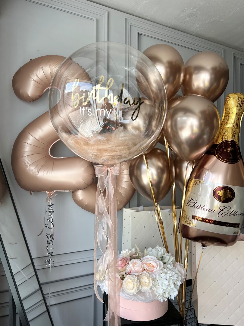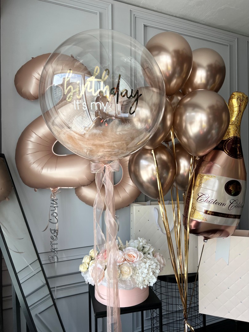 устроить «шампанскую бурю» из шаров при входе именинника;