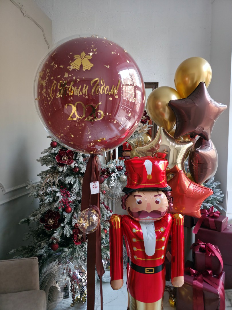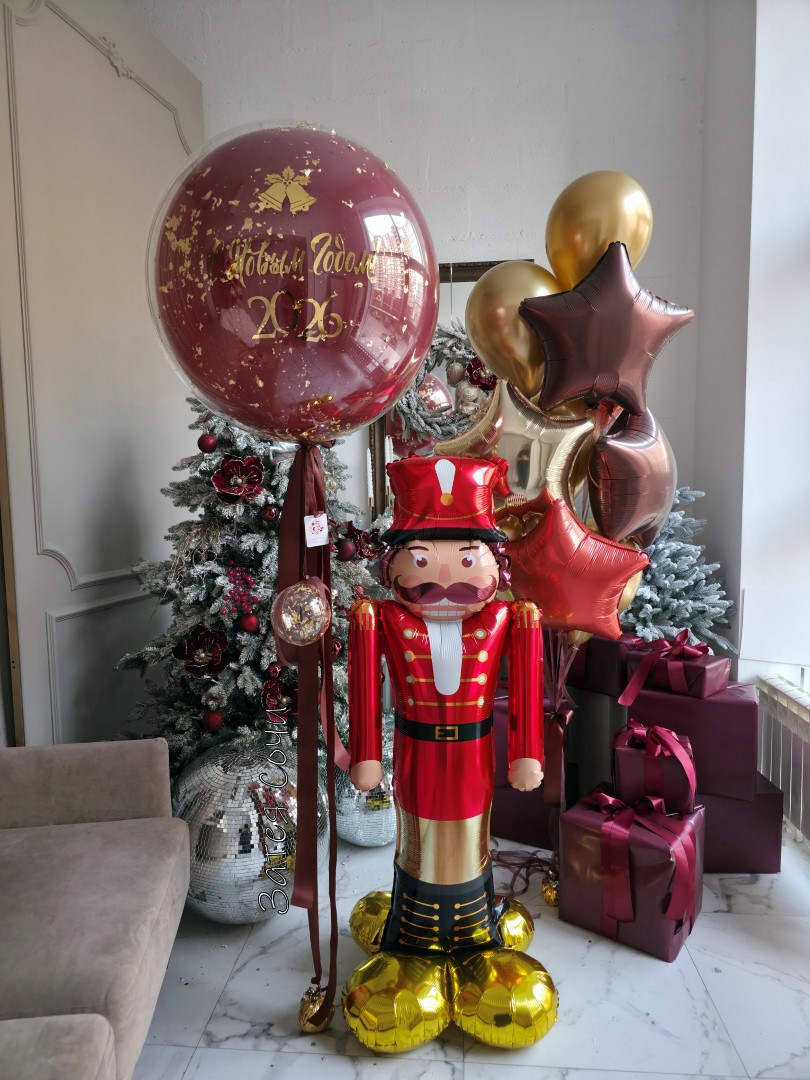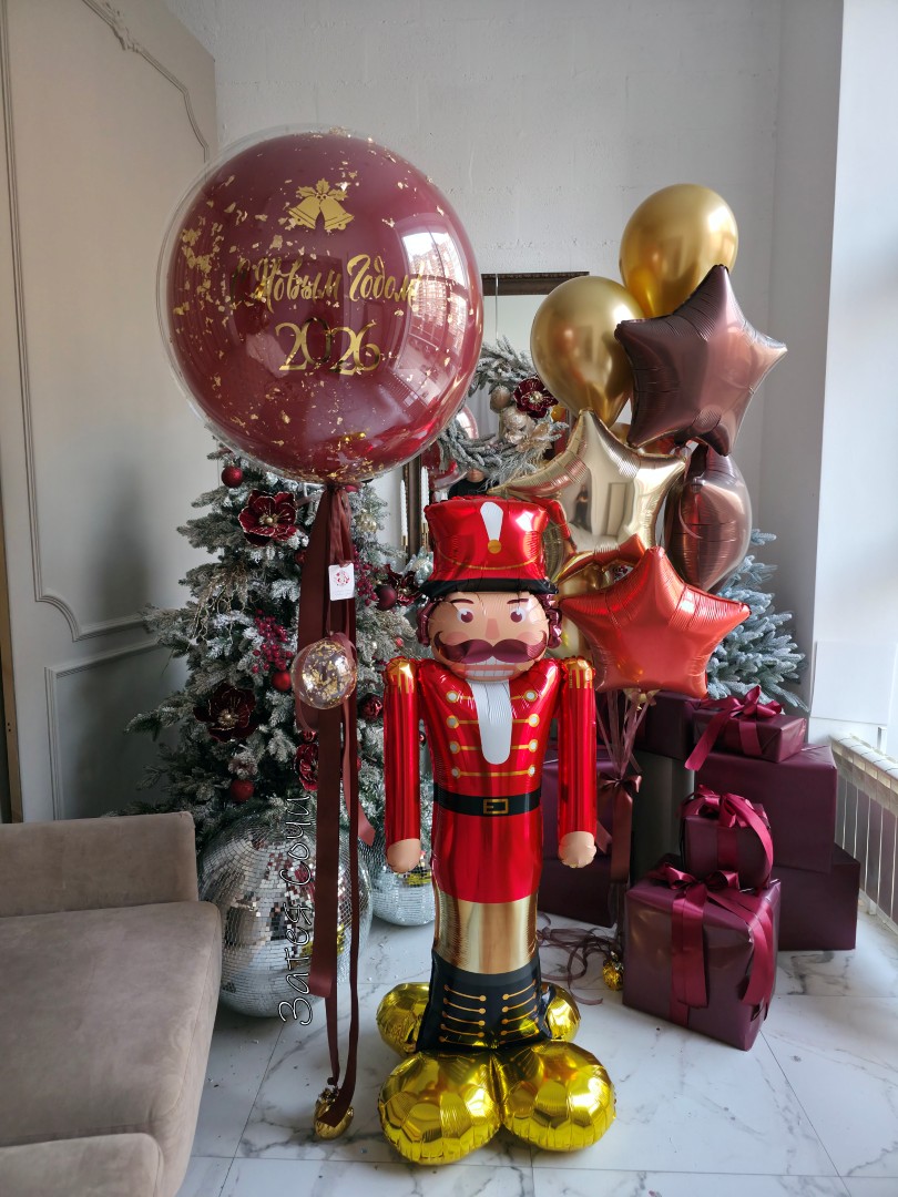 большой шар с надписью и шар в форме щелкунчика станут центром композиции.