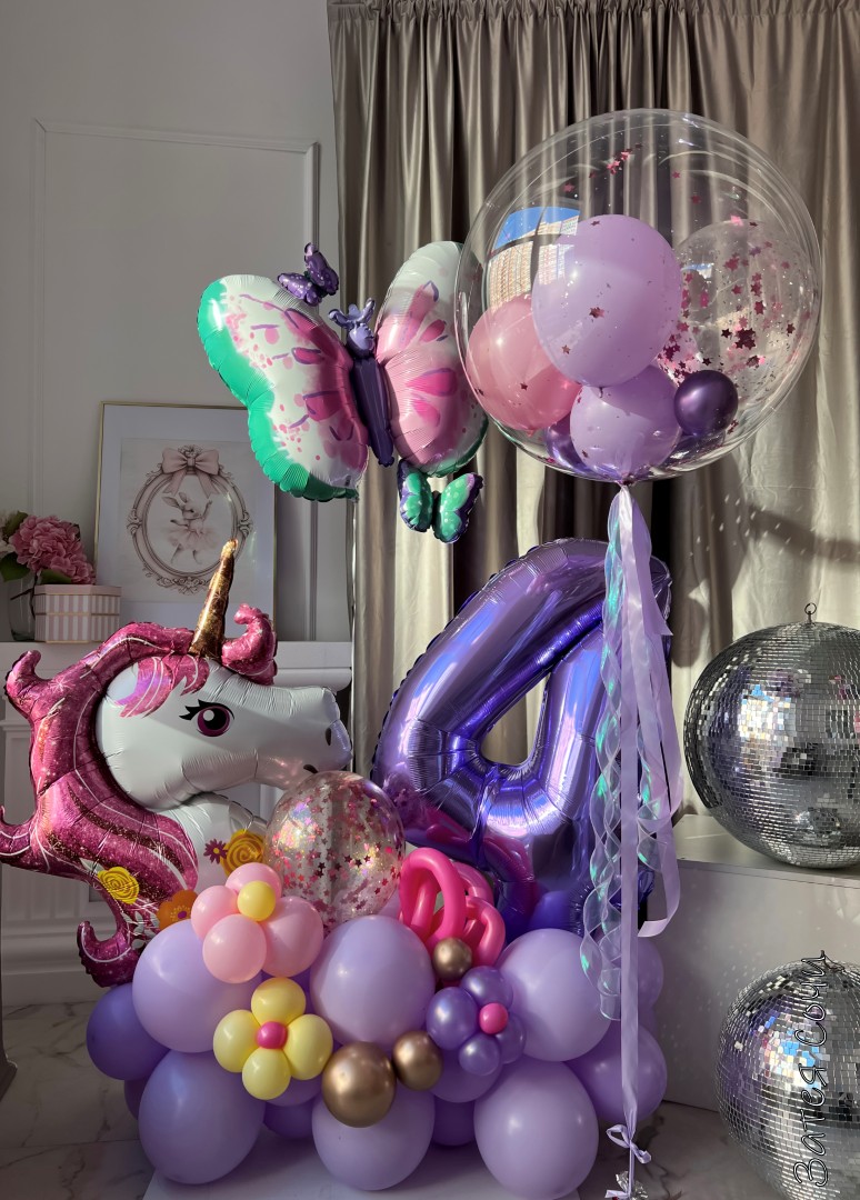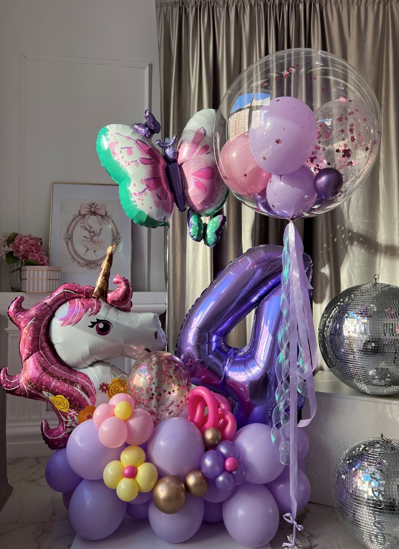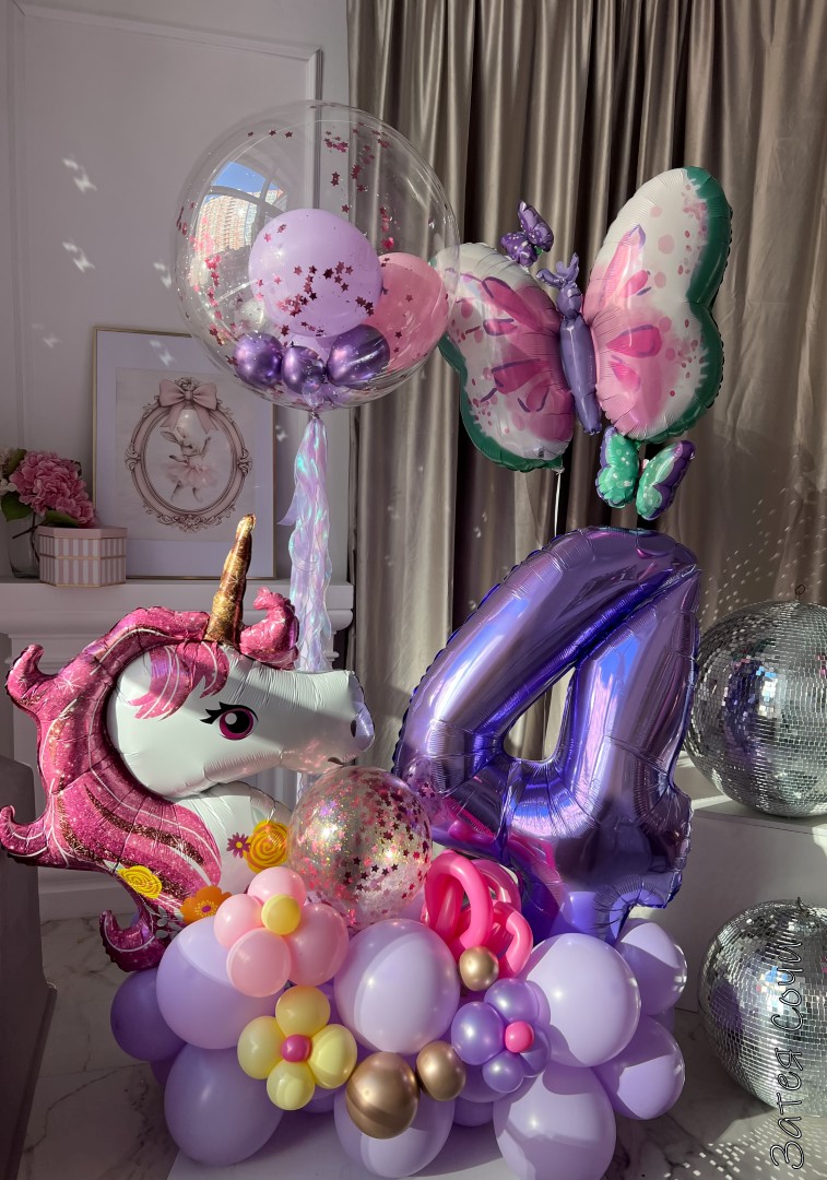 гелиевые и латексные шары с изображениями единорогов и сказочных мотивов;