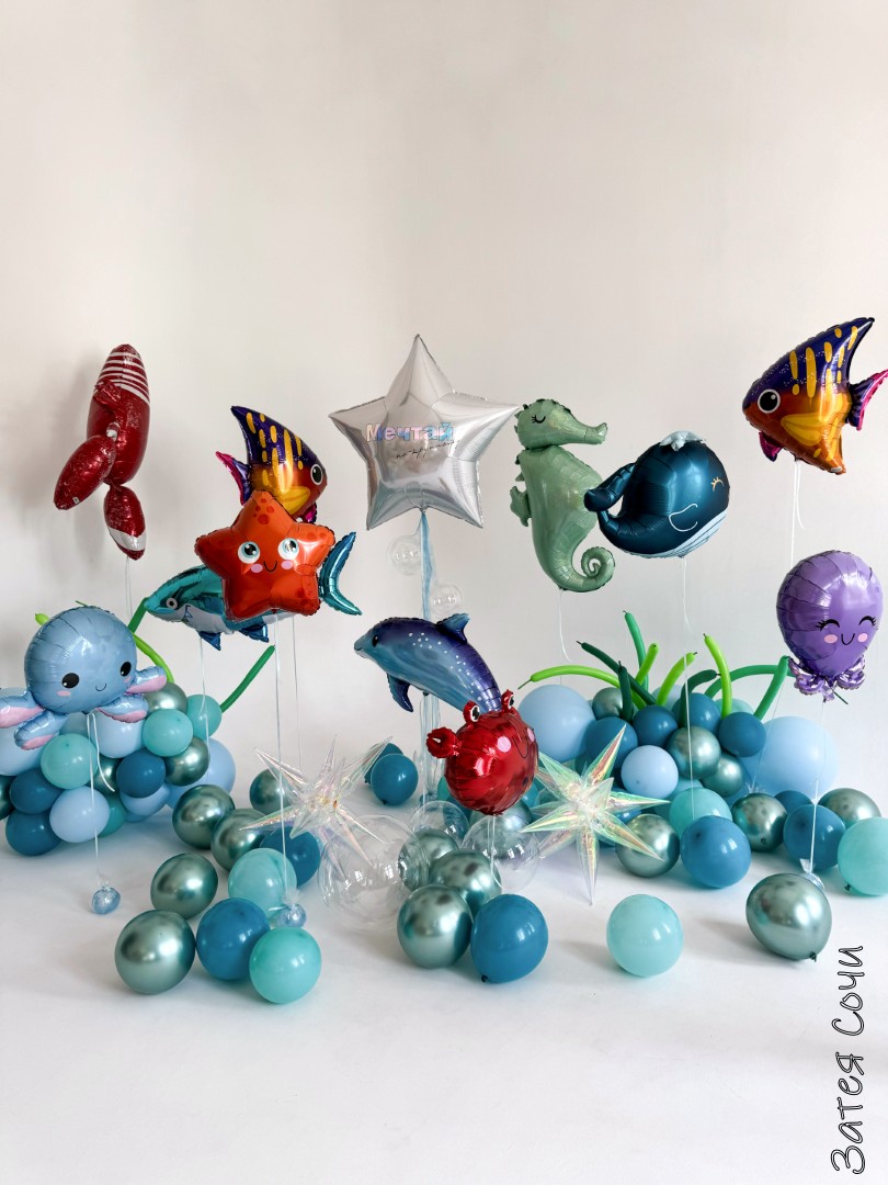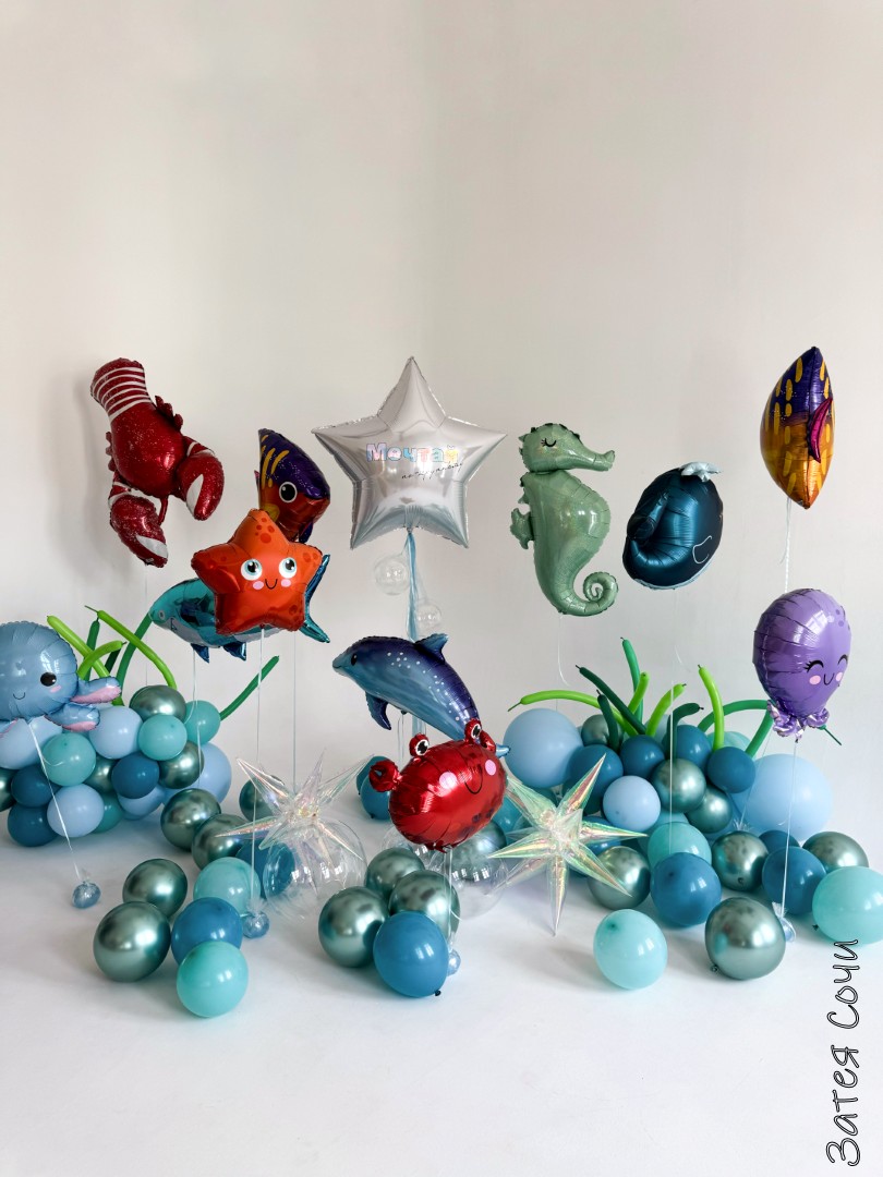 гелиевые и латексные шары на заданную тему (рыбки, осьминоги, морские звёзды);