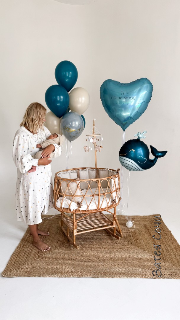 большой центральный шар с трогательной надписью («Добро пожаловать домой!», «Наш малыш» или «Ты наше море») — душа праздника;