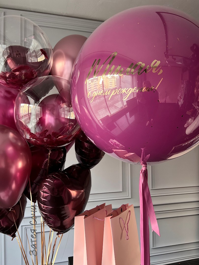 Набор шаров «Милая: с днём рождения!» — праздник в оттенке винограда с воздушным шармом!Хотите, чтобы торжество парило в облаке радости? Наш набор превратит любой повод в сказку: шары цвета сочного винограда, фонтан из латексных, фольгированных и прозрачных шаров с перьями внутри — и, конечно, большой шар с вашей персональной надписью.