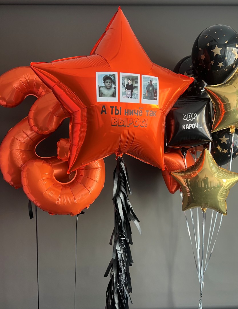 Набор шаров «Ни чё так вырос!» — праздник с характером и блеском!20 лет? 30? А может, целых 50? Пора отметить веху с юмором! Наш набор — идеальный способ сказать: «Ты реально крут!» Оранжевые, чёрные и золотые шары создают дерзкий ансамбль, большая звезда с вашей надписью — главный акцент, а фонтан на тему праздника задаёт настроение.