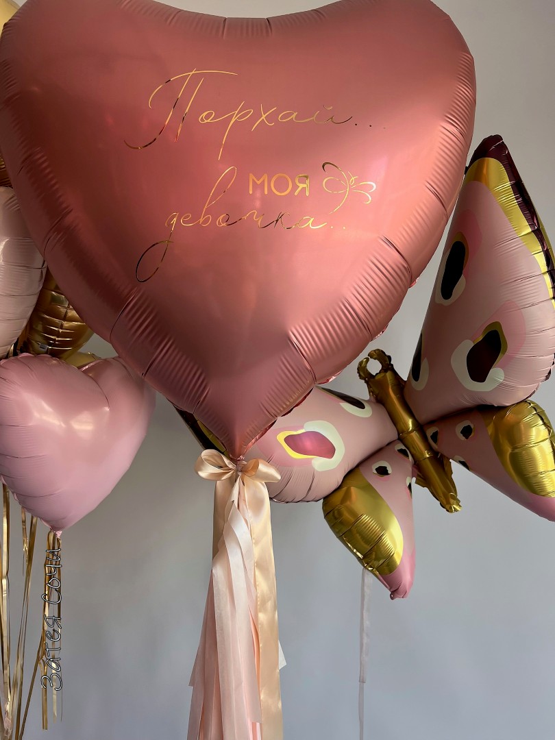 Набор шаров «Порхай, моя девочка» — праздник в розовых облаках!Хотите подарить море эмоций и немного волшебства? Наш набор превратит любой повод в трогательный праздник! Большое розовое сердце с вашей персональной надписью — главный акцент, а фонтан из 8 фольгированных сердец и бабочка создают атмосферу нежной сказки.