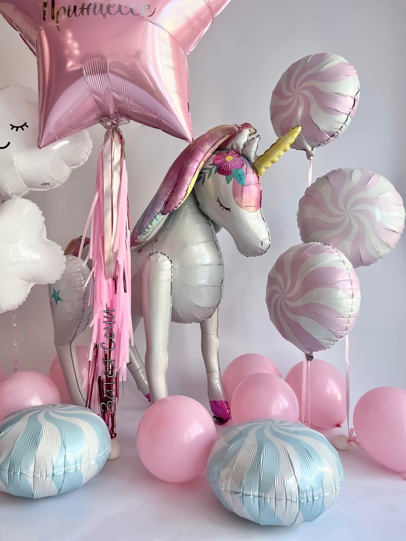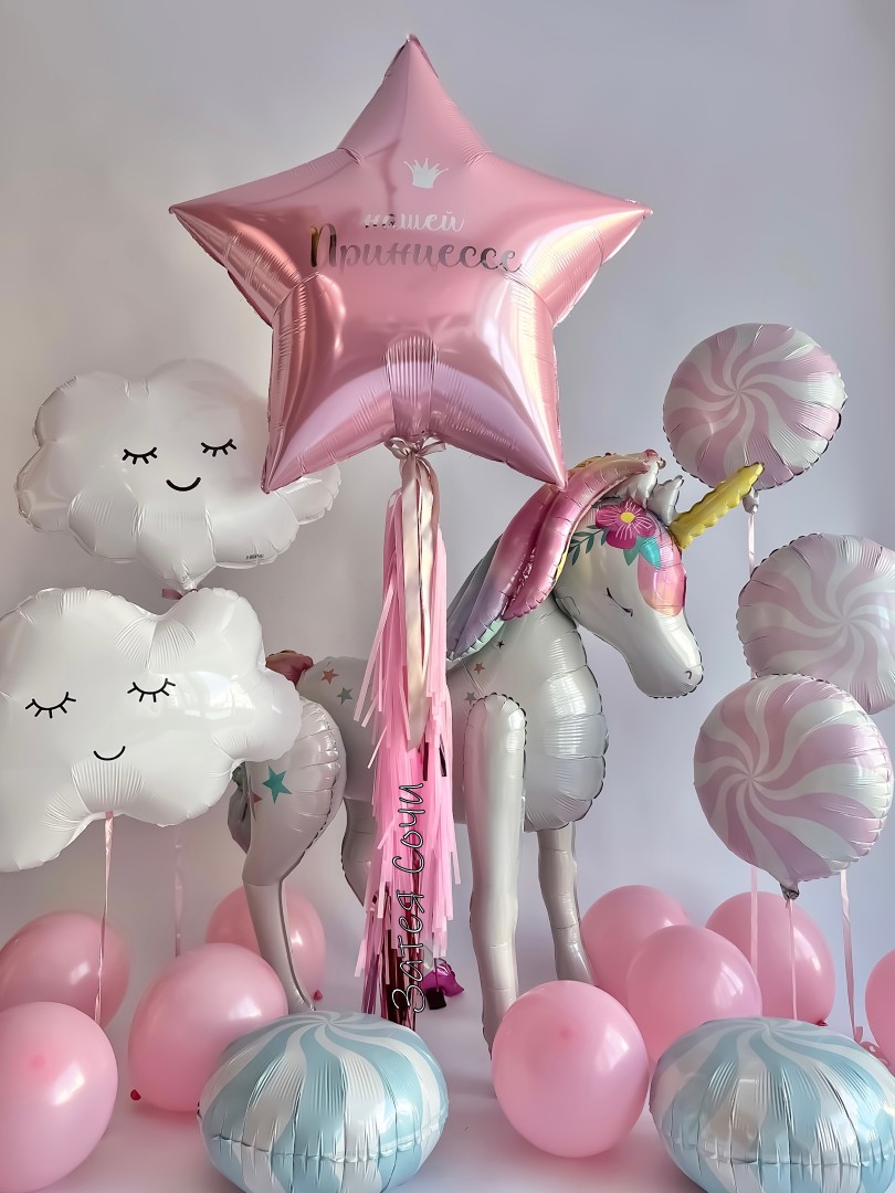 Набор шаров «Нашей Принцессе» — праздник в розово‑белой сказке!Мечтаете о торжестве, от которого сердце замирает, как у маленькой принцессы? Наш набор превратит любой день в королевский приём! Нежно‑розовые и белые оттенки дарят ощущение волшебства, звезда с вашей надписью сияет, как личное созвездие, облачка плывут, словно мечты, шары‑леденцы добавляют игривости, а большой шар с единорогом становится главным чудом композиции.