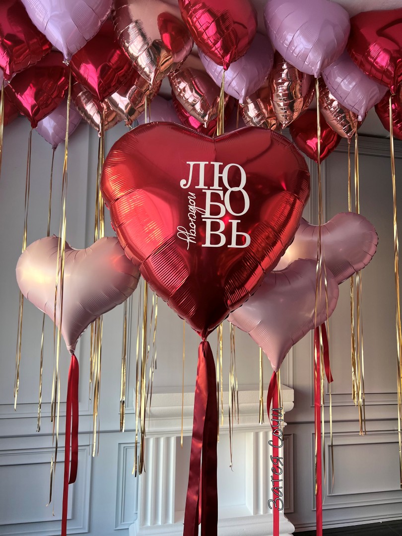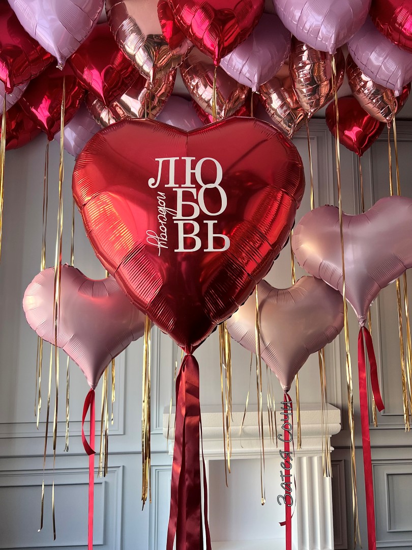 Набор шаров «Любовь повсюду» — праздник, от которого сердце тает!Хотите окутать любимого человека облаком нежности? Наш набор превратит любое помещение в царство романтики! Пылающий красный, нежный розовый и благородное розовое золото создают волшебную палитру, большое сердце с вашей надписью шепчет главные слова, элегантные сердца и шары под потолок формируют атмосферу бесконечной любви.