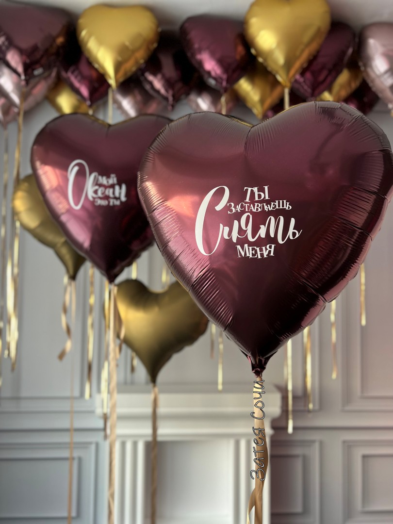 Набор шаров «Мой океан — это ты»: романтика в золоте и бургунди!Хотите сказать «ты — целый мир для меня» без лишних слов? Наш набор превратит признание в волшебное шоу! Благородное золото и глубокий бургунди создают атмосферу трепетного признания: элегантные сердца шепчут о чувствах, шары под потолок добавляют воздушности, а два сердца с вашей надписью говорят то, для чего не нужны переводы.