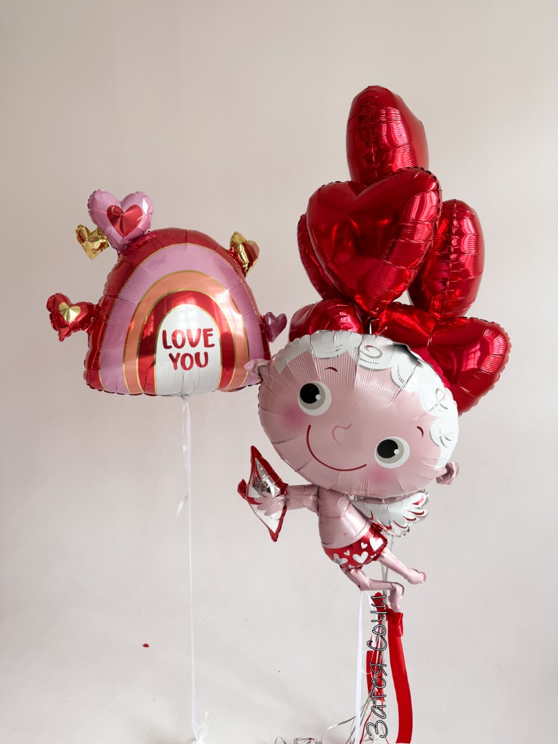 Набор шаров «Купидон» — порция волшебства и романтики в одном флаконе!Представьте: в воздухе парит яркая радуга, украшенная нежными красными сердечками, рядом — сам Купидон, готовый пустить стрелу в самое сердце, а вокруг них расцветает фонтан из 7 алых сердец. Словно маленький праздник любви, который легко принести домой!