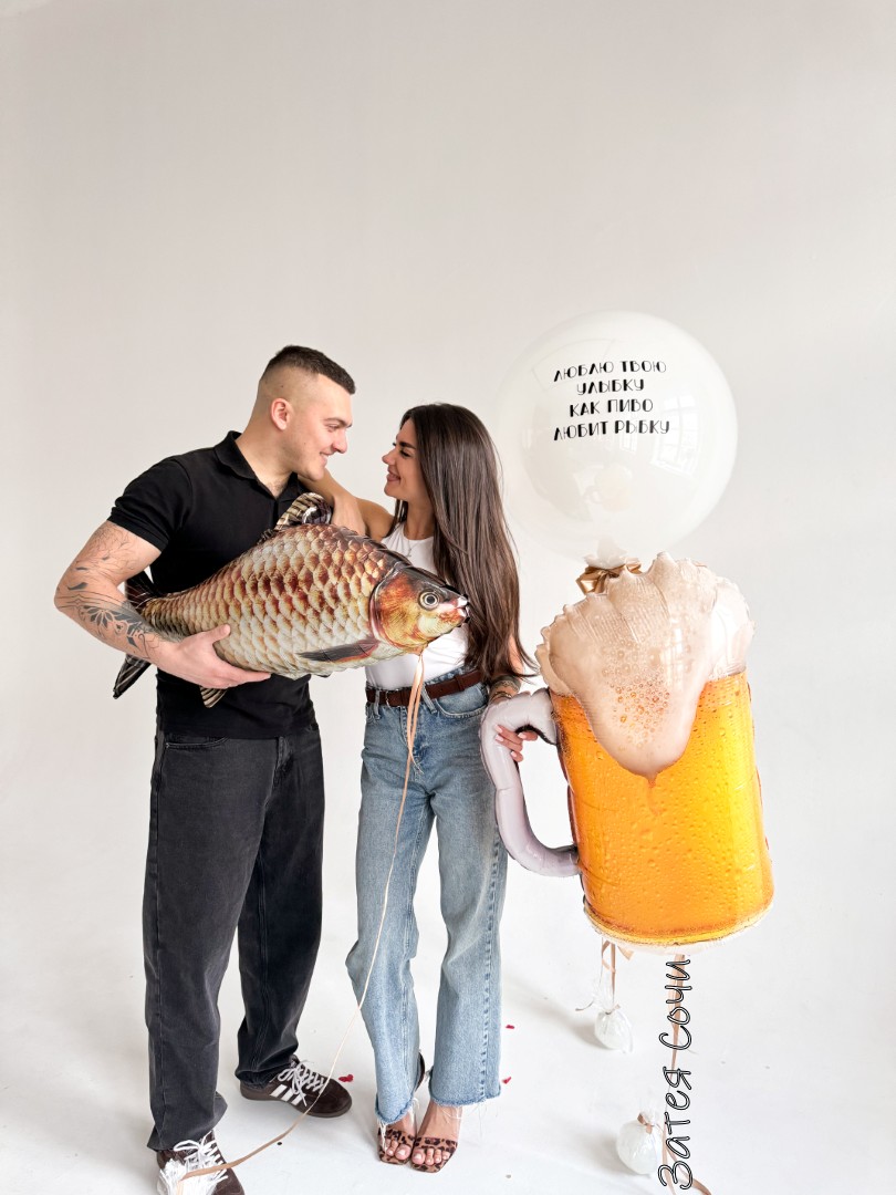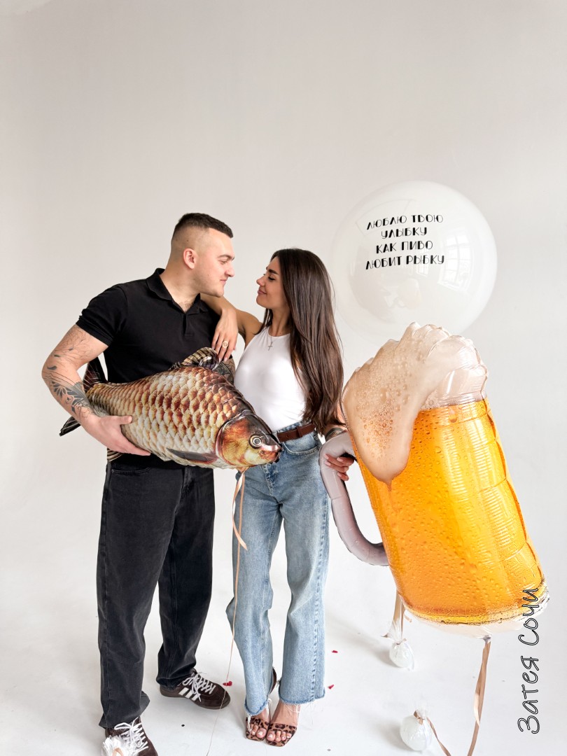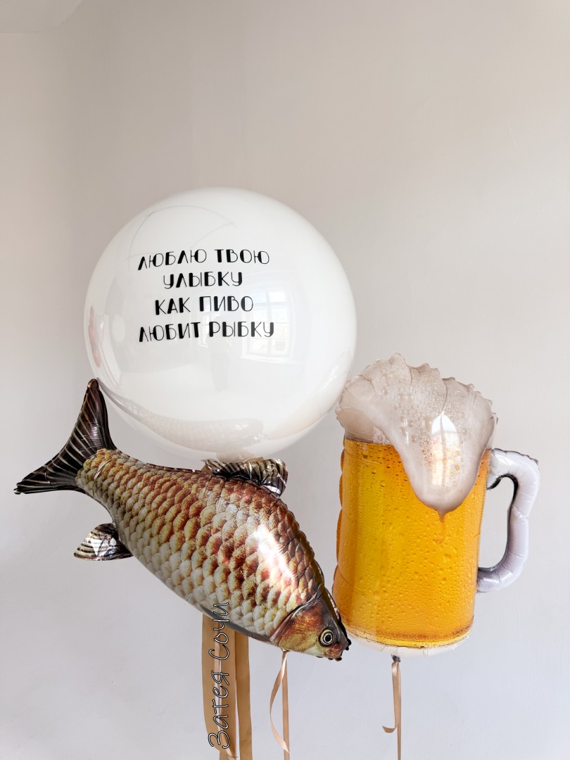 большой шар с персональной забавной надписью «Люблю твою улыбку как пиво любит рыбку»;