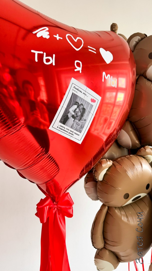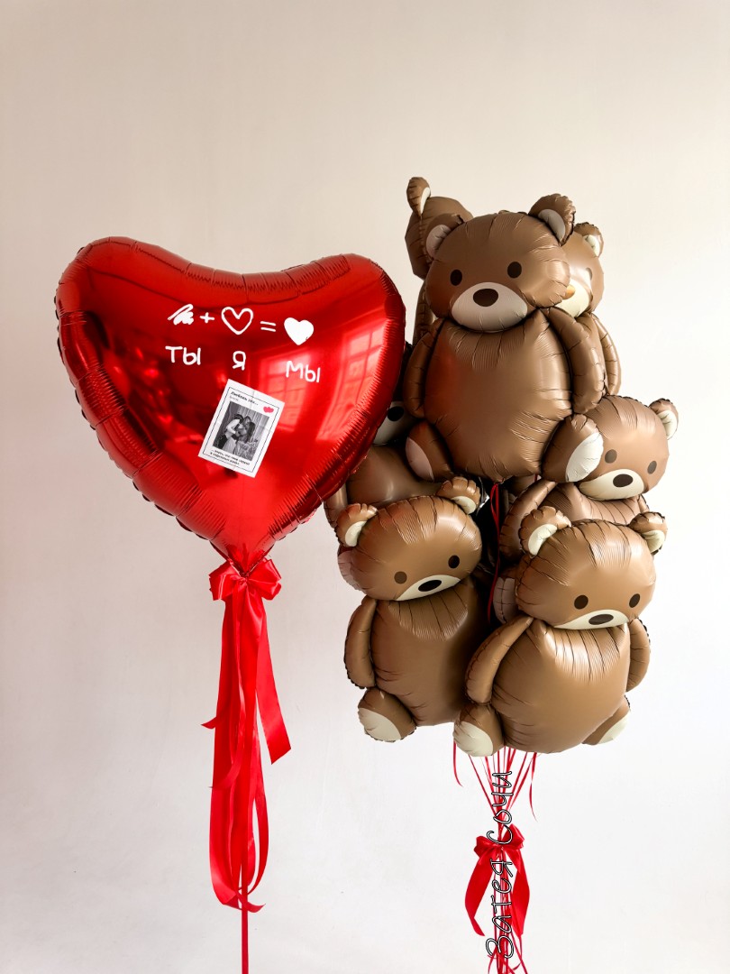 Набор шаров «Ты Я Мы» — трогательно, мило и незабываемо!Хотите сделать сюрприз, от которого на лице расцветёт улыбка? Наш набор объединил романтику и детскую радость: большое сердце с вашим фото и надписью плюс весёлый фонтан мишек Барни!
