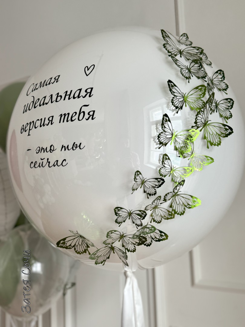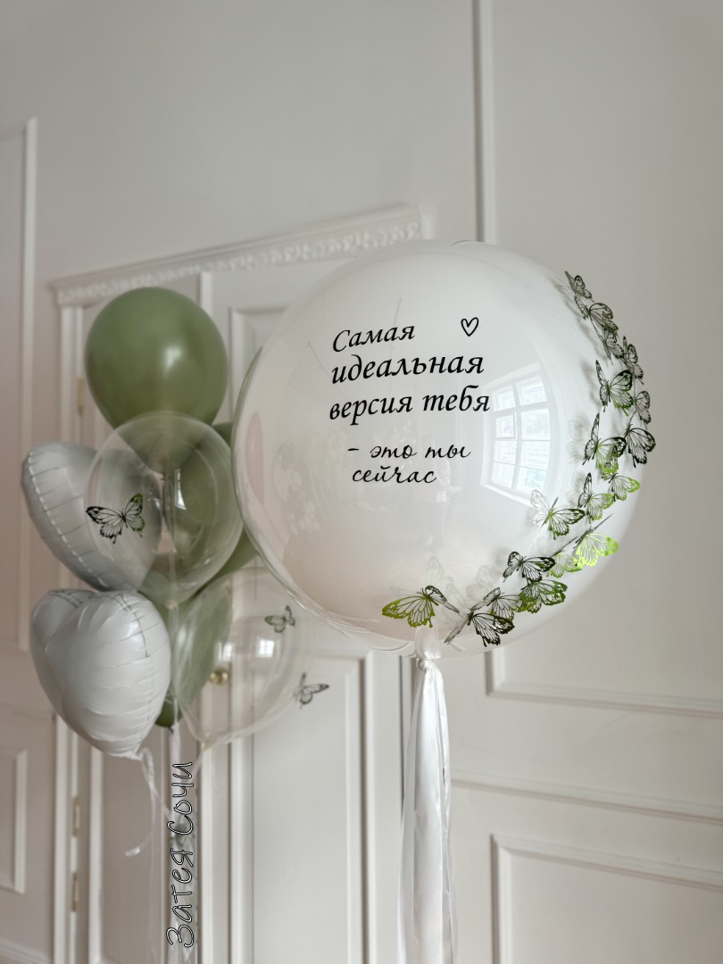 большой шар с персональной надписью «Самая идеальная версия тебя — это ты сейчас» и нежными бабочками — стильный центр композиции;