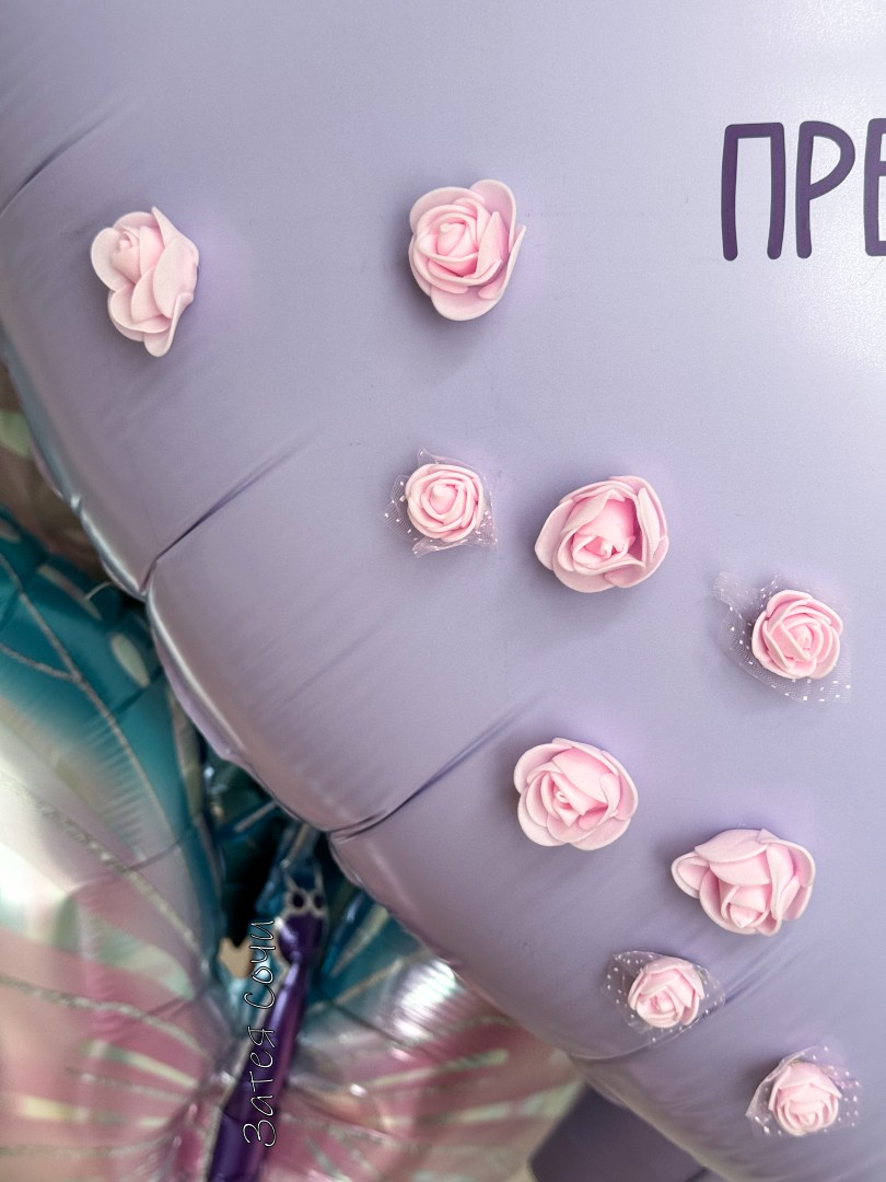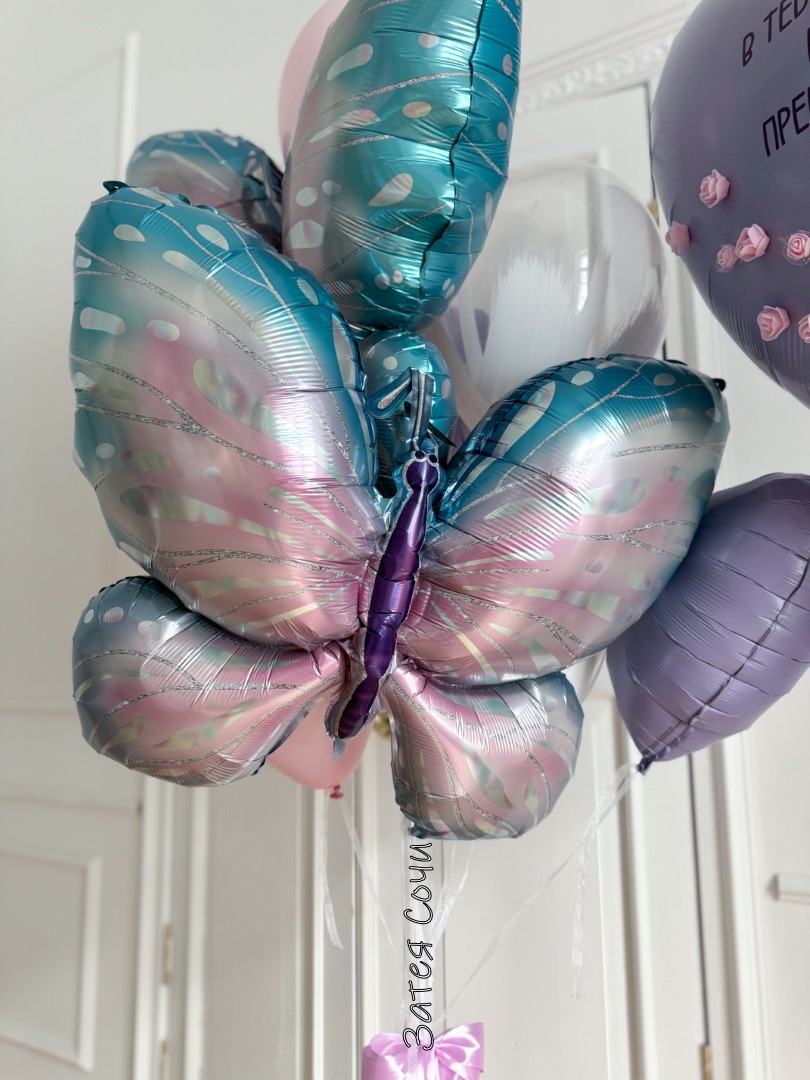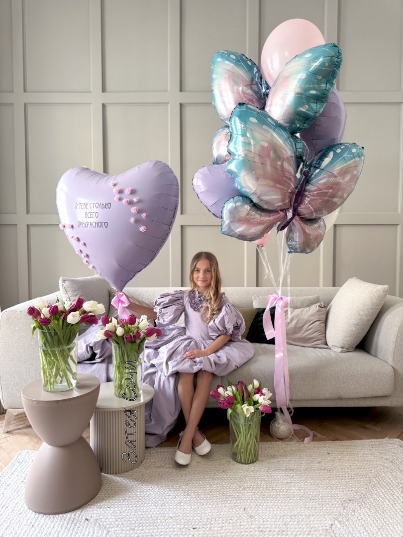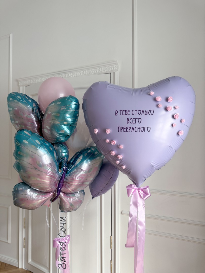 большой шар‑сердце с персональной надписью «В тебе столько всего прекрасного» и изящными бабочками — трогательный центр композиции;