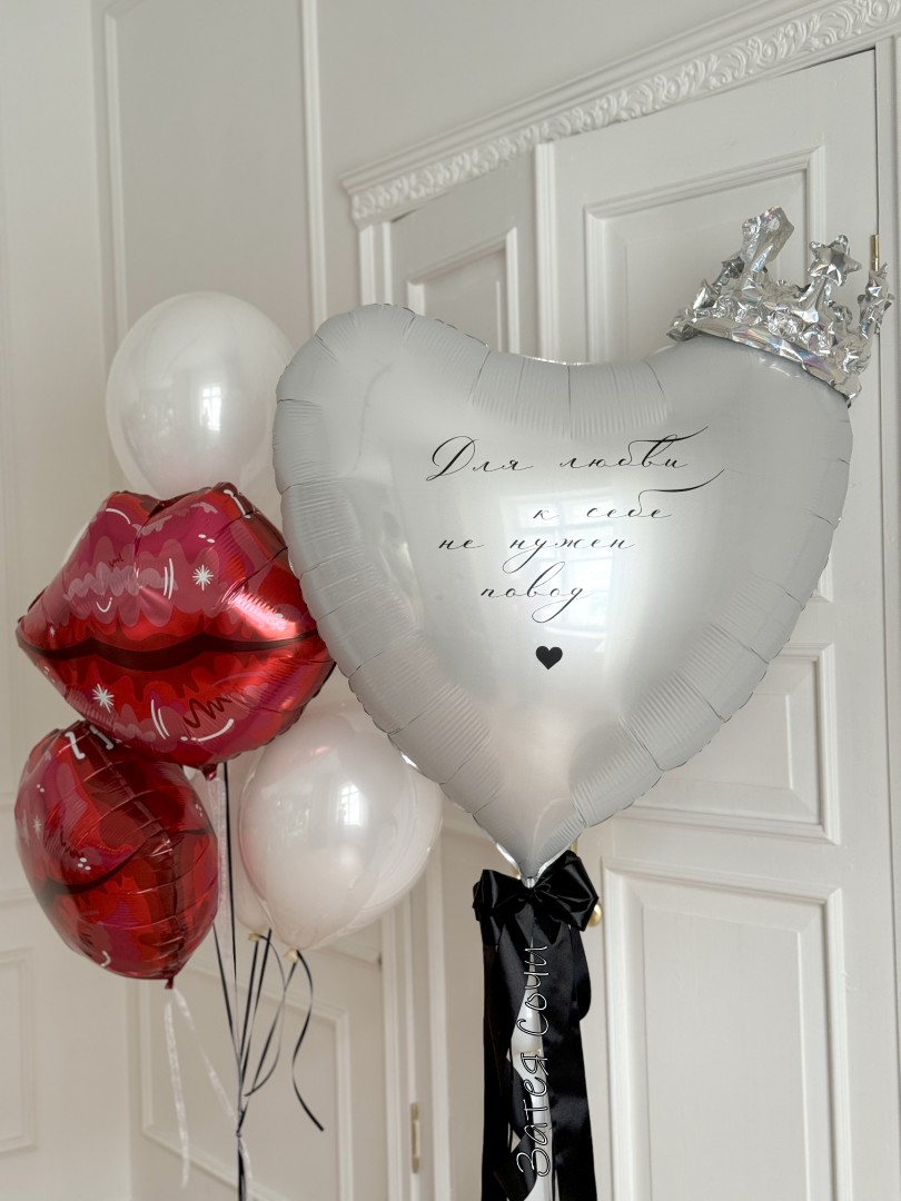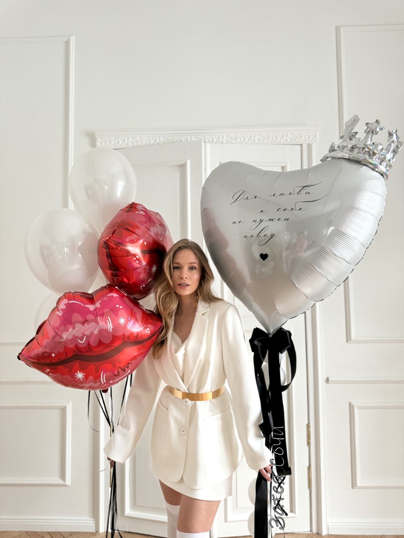 большое серебряное сердце с короной и персональной надписью «Для любви к себе не нужен повод» — стильный центр композиции;