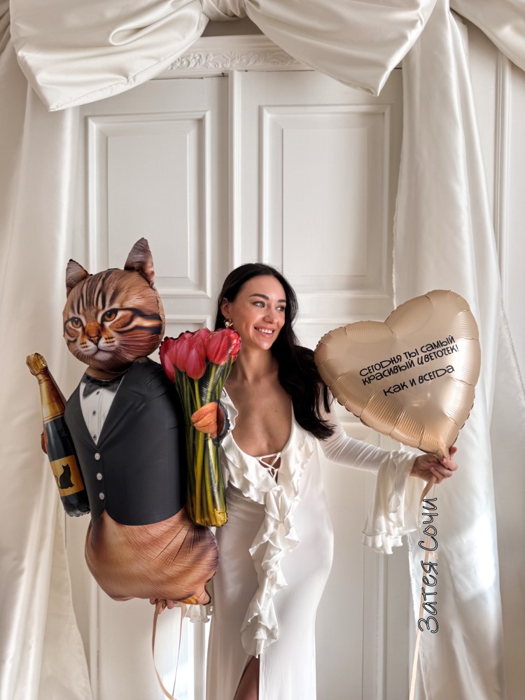 Большой шар в форме галантного кота — настоящий денди весны: во фраке, с тюльпанами и бутылкой шампанского. Говорит без слов: «Мадам, ваш праздник начинается — позвольте преподнести вам капельку веселья!»