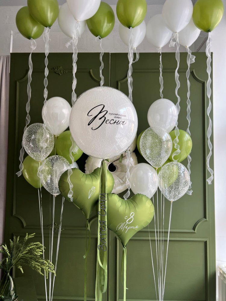 Два шара в форме элегантного сердца фисташкового цвета — добавляют композиции нежности и теплоты, будто маленькие весенние объятия.
