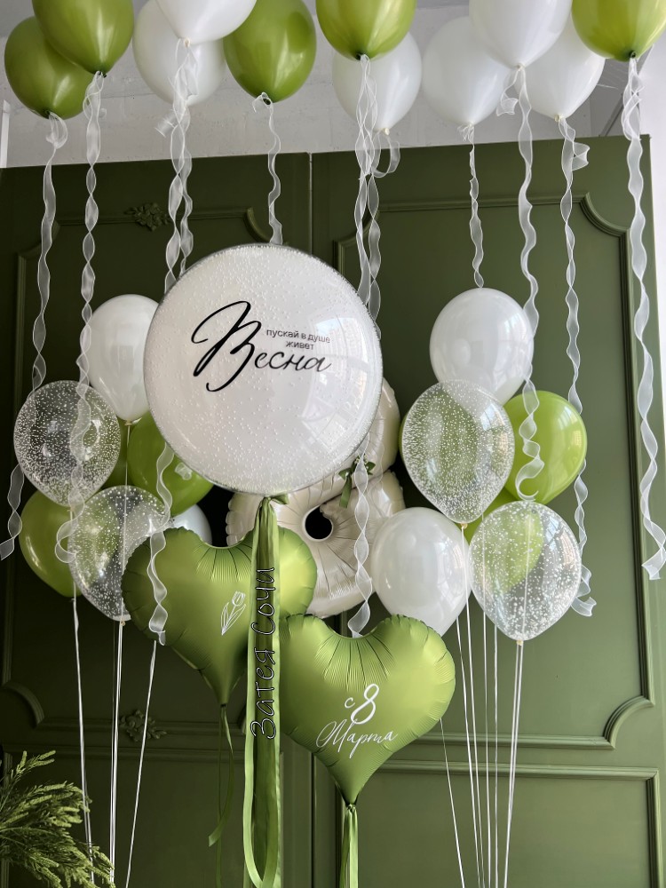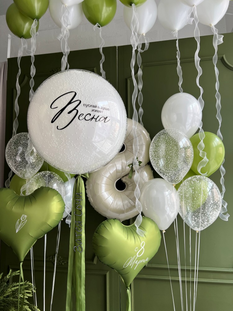 Большой «стеклянный» белый шар с персональной надписью «Пускай в душе живёт Весна» — главный акцент композиции. Прозрачность и лёгкость создают эффект невесомости, а надпись задаёт нужный настрой.