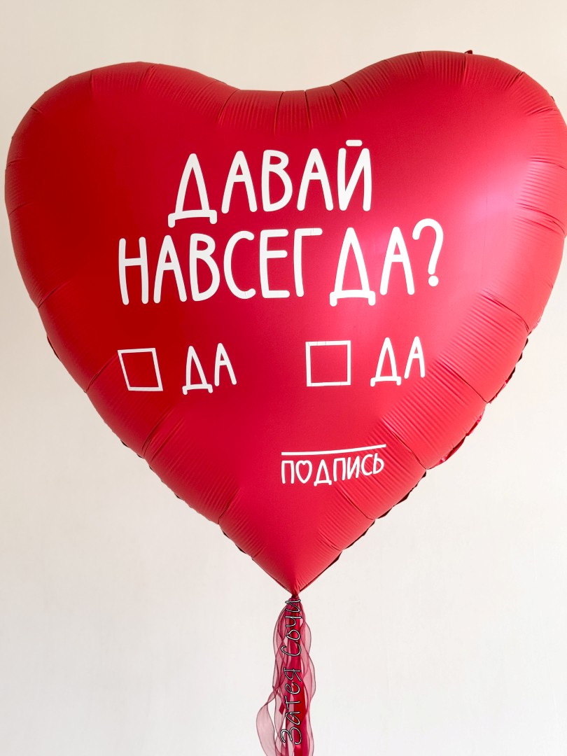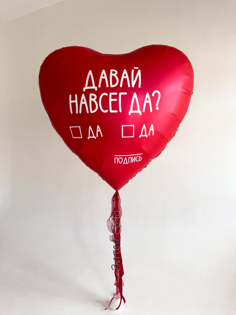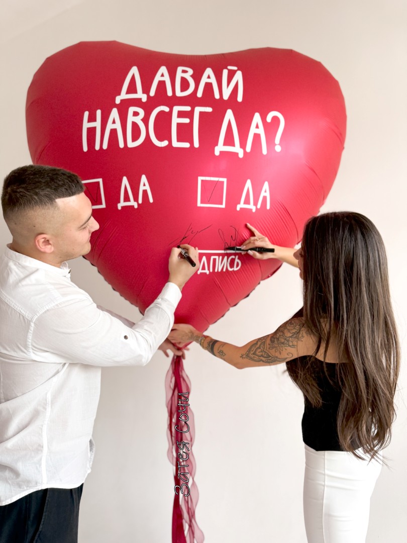 Сердце‑ГИГАНТ с надписью «Давай навсегда?» — романтический жест с изюминкой!Хотите сделать трогательное признание незабываемым? Наш гигантский шар‑сердце с персональной надписью и местом для автографа превратит «да» в памятный артефакт вашей истории любви.