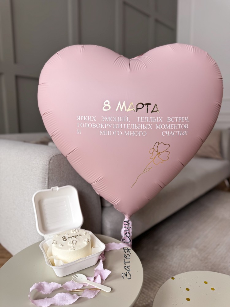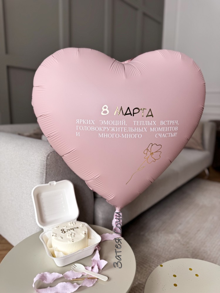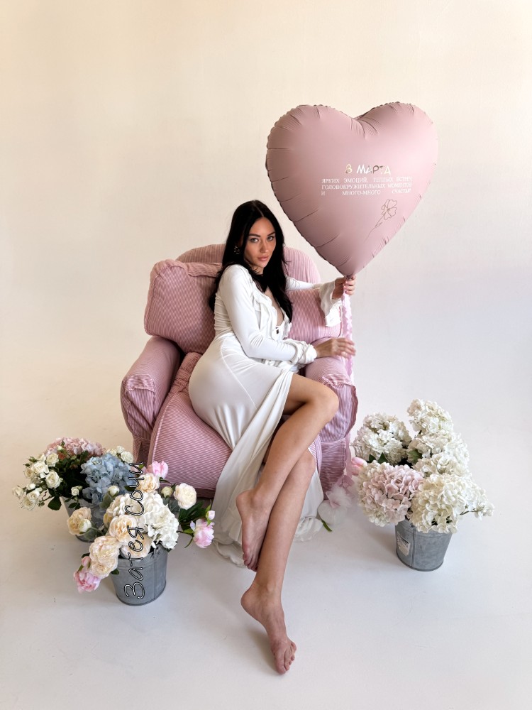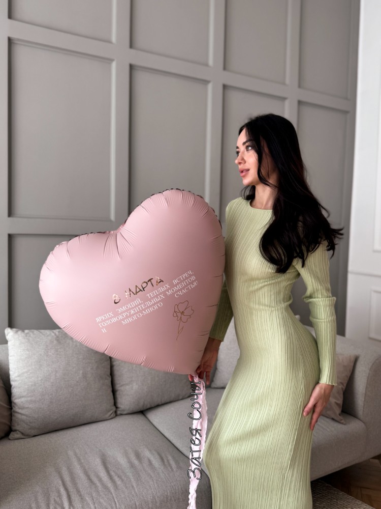 Большой шар в форме сердца нежно‑розового цвета с гелием — парит в воздухе, словно воплощение самых светлых пожеланий. Нежно‑розовый оттенок напоминает первые весенние цветы: он мягкий, тёплый и невероятно уютный.