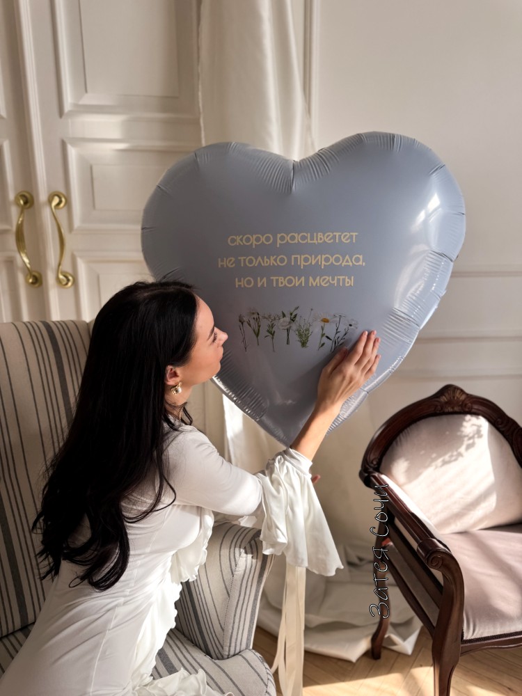 Большой шар в форме сердца голубого цвета с гелием — лёгкий, парящий, словно первая весенняя мечта. Голубой оттенок напоминает ясное небо — бескрайнее и полное возможностей. Шар взлетает под потолок и будто говорит: «Всё возможно!»