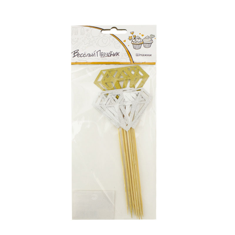 Шпажки для канапе «Бриллиант» Золото и Серебро - неотъемлемая часть праздничного фуршета. Они добавят оформлению стола дополнительных ярких акцентов и разнообразят праздничный стол. Шпажки изысканны, утончены и эстетичны. Универсальные цвета серебряного и золотого цвета подчеркнут элегантность праздничного оформления стола, а сияние глиттера добавит лоска.Набор: 7 шт.