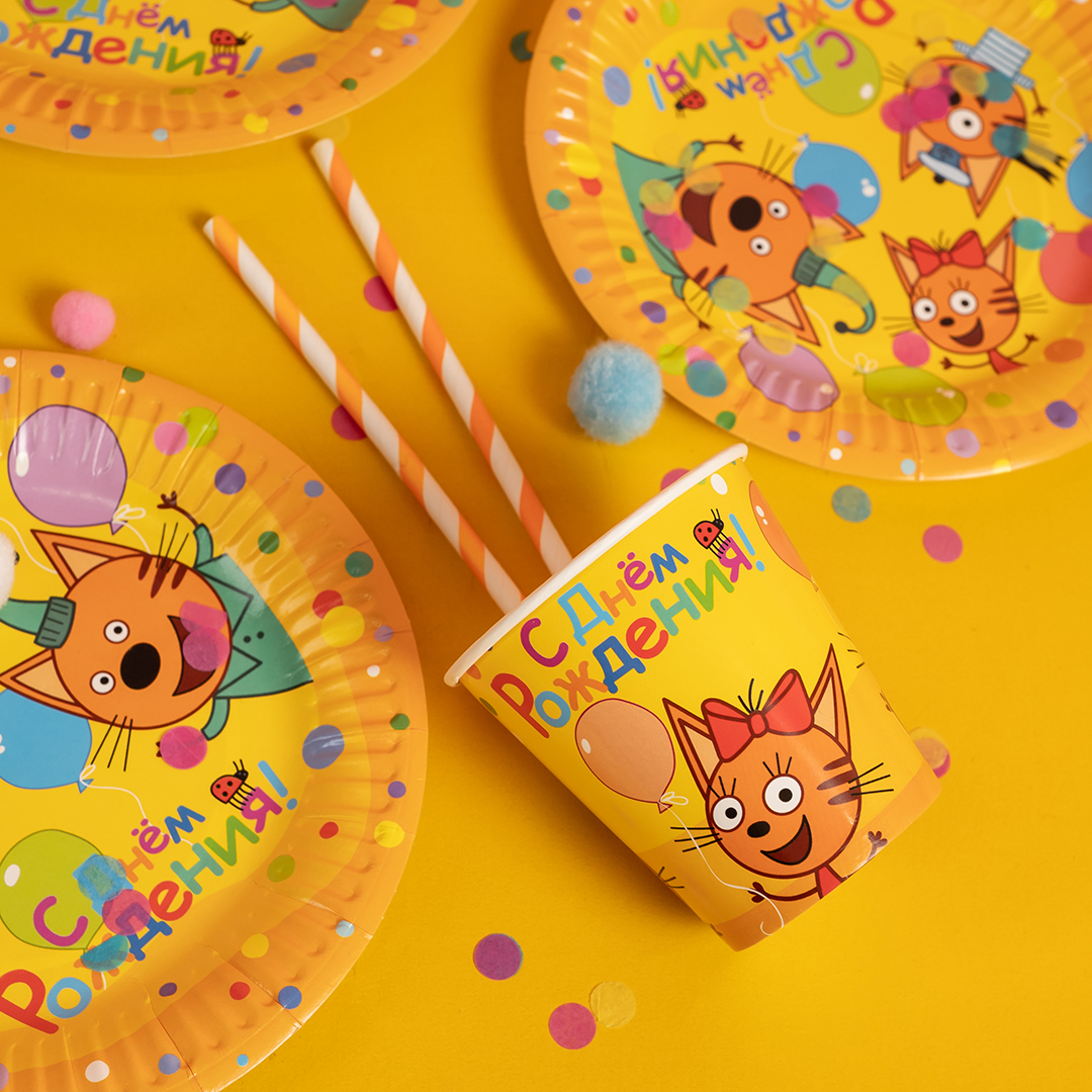 Красочная одноразовая посуда с любимыми персонажами мультфильма "Три Кота" станет дополнительным украшением праздника, а также поможет минимизировать время организации торжества.Оригинально подобранный дизайн будет прекрасным атрибутом и для пикника на природе, и для любого события с близкими людьми и друзьями.