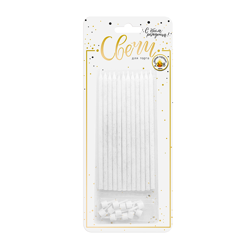 Набор свечей представлен в однотонном классическом варианте белого цвета с серебряным глиттером. Уникальный размер 15 см и гладкая форма свечи эстетично дополнит самые лаконичные дизайны праздничного торта.