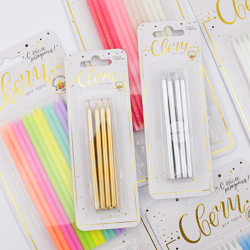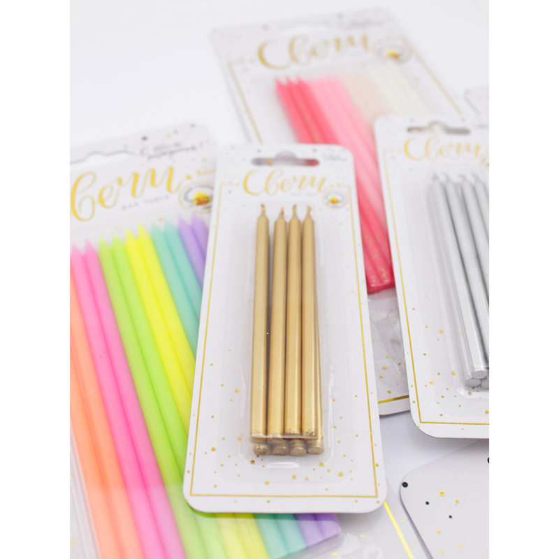Набор свечей представлен в однотонном классическом варианте золотого металлизированного цвета Уникальный размер 10 см., и гладкая форма свечи эстетично дополнит самые лаконичные дизайны праздничного торта.