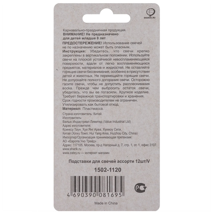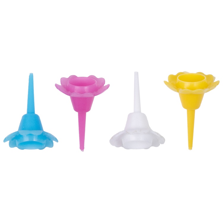 Пластмассовые держатели для свечей в торт с разной резьбой, чтобы Вы могли поставить в них свечи разного диаметра. Подставки расчитаны на два размера свечей 6 и 8 см в диаметре. Высота подставки 2 см., в упаковке 12 подставок в цветовой гамме: розовый, голубой, белый, желтый.