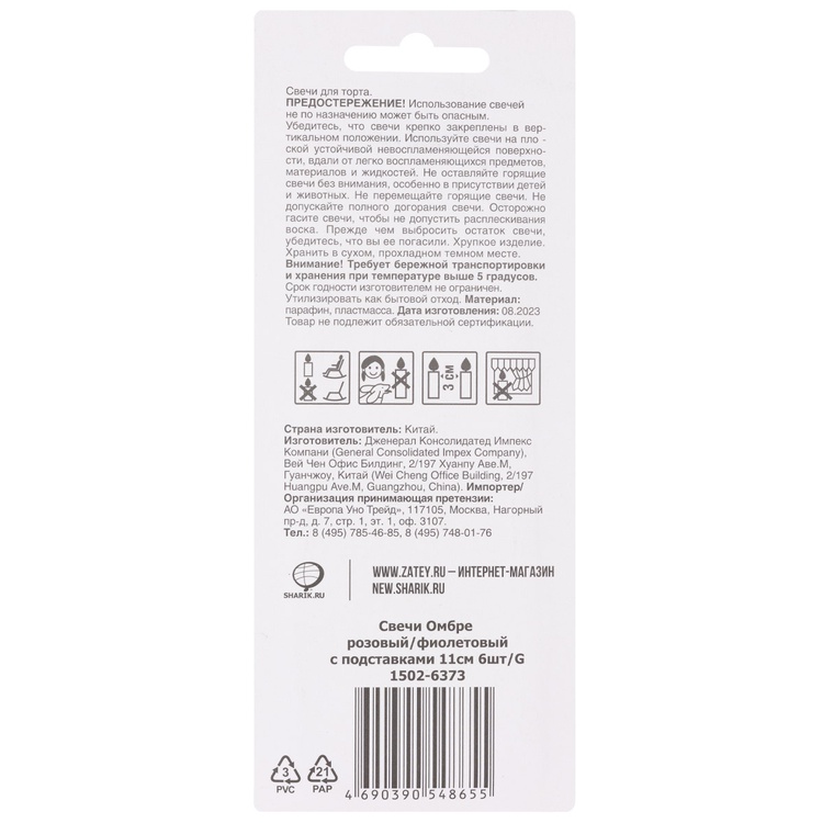 Размеры свечи: высота - 11см, диаметр - 0,5см. В упаковке 6 свечей с подставками. Внимание! Хранение и транспортировка при температуре выше 5 °C.