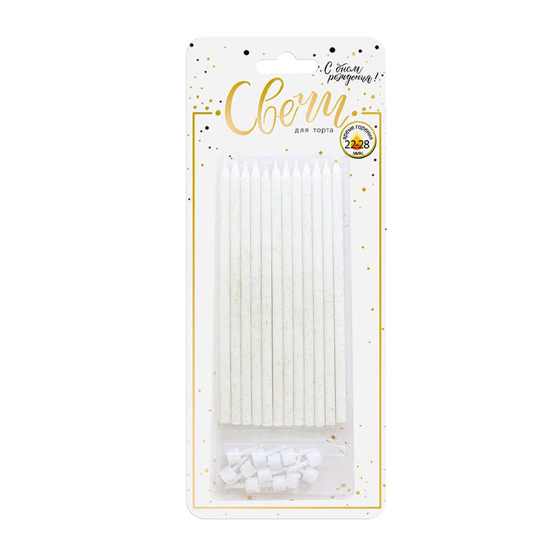 Набор свечей представлен в однотонном классическом варианте белого цвета с золотым глиттером. Уникальный размер 15 см и гладкая форма свечи эстетично дополнит самые лаконичные дизайны праздничного торта.