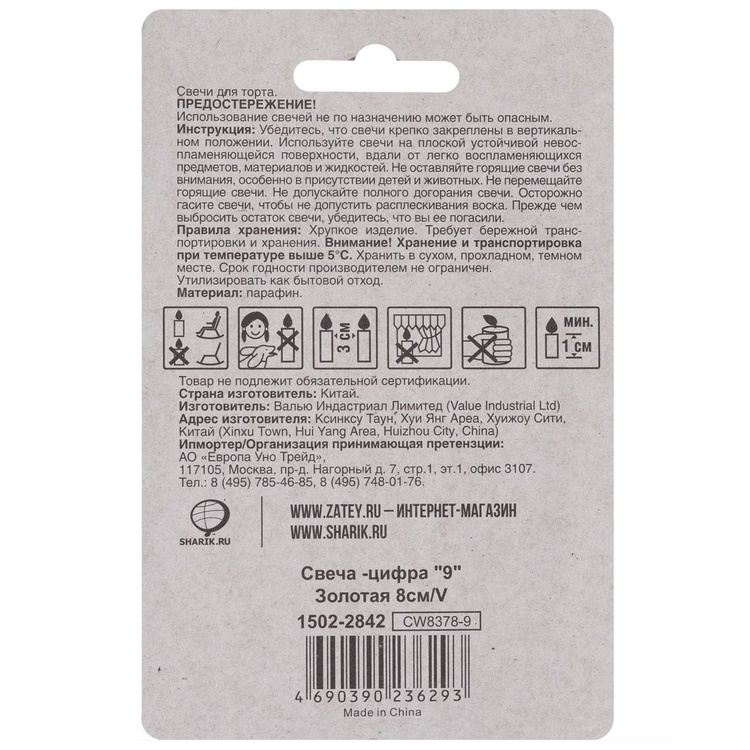 Свеча поставляется в индивидуальной упаковке, что обеспечивает сохранность товара при транспортировке и хранении. В упаковке находится одна свеча-цифра 9 золото.
