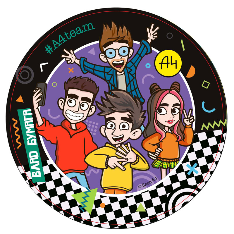Влад А4 (Бумага) - самый популярный блогер youtube формата shorts в 2021 году. Прославился за счет роликов в формате челленджей. Он имеет самый популярный русскоязычный youtube канал для детей, обладатель бриллиантовой кнопки youtube.Набор бумажных тарелок «Влад А4» − стильный элемент для украшения праздничного стола и комнаты в День Рождения.