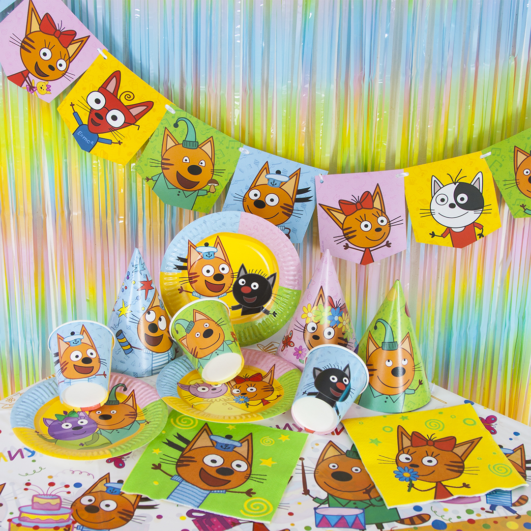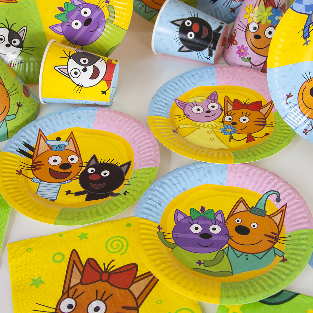 Красочная одноразовая посуда с любимыми персонажами мультфильма "Три Кота" станет дополнительным украшением праздника, а также поможет минимизировать время организации торжества.Оригинально подобранный дизайн будет прекрасным атрибутом и для пикника на природе, и для любого события с близкими людьми и друзьями.