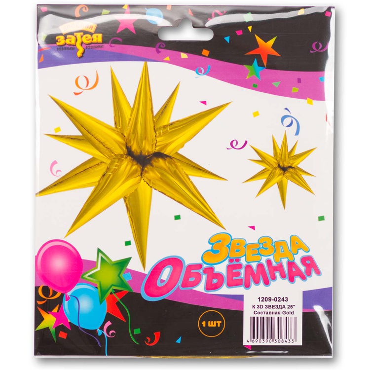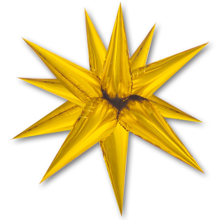 Воздушный шар в форме объёмной многогранной звезды. Изготовлен из тонкой лавсановой пленки.Комплект содержит 13 элементов (конусов) - 12 используются для составления звезды, 13-й запасной. Каждый элемент имеет встроенный клапан и надувается воздухом. Надутые элементы необходимо попарно связать между собой за хвосты и затем соединить пары друг с другом таким образом, чтобы получилась звезда.