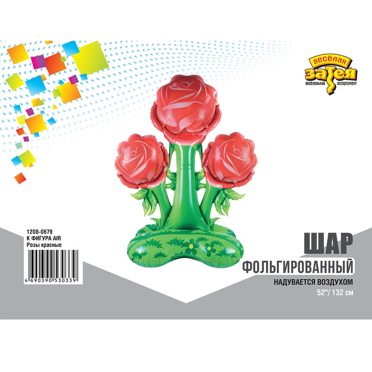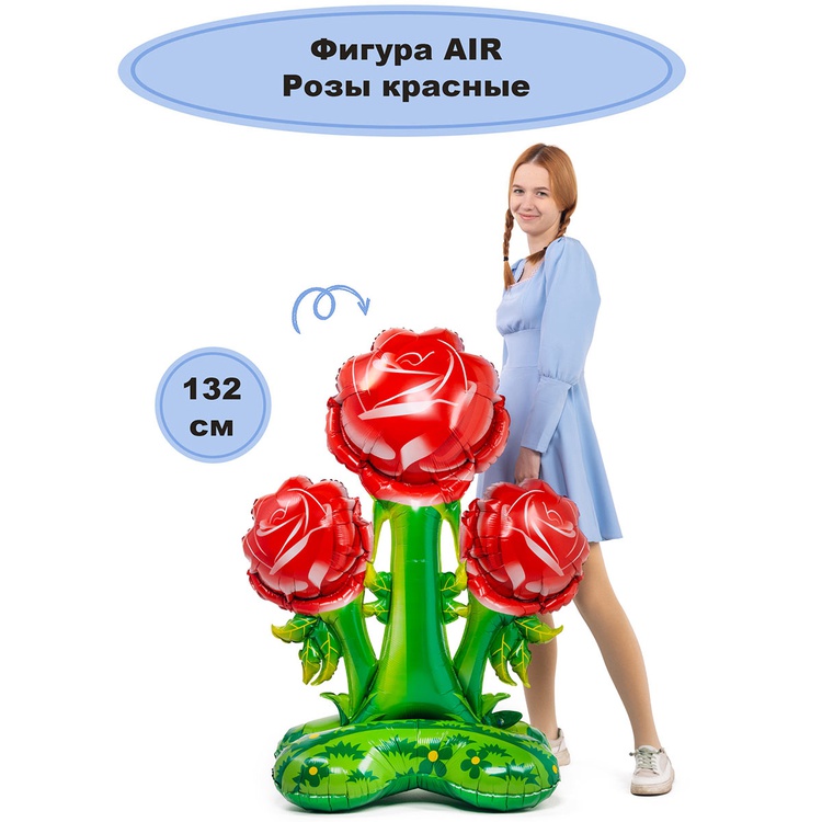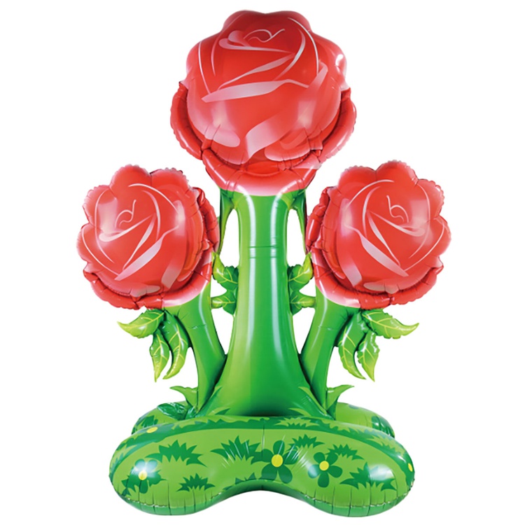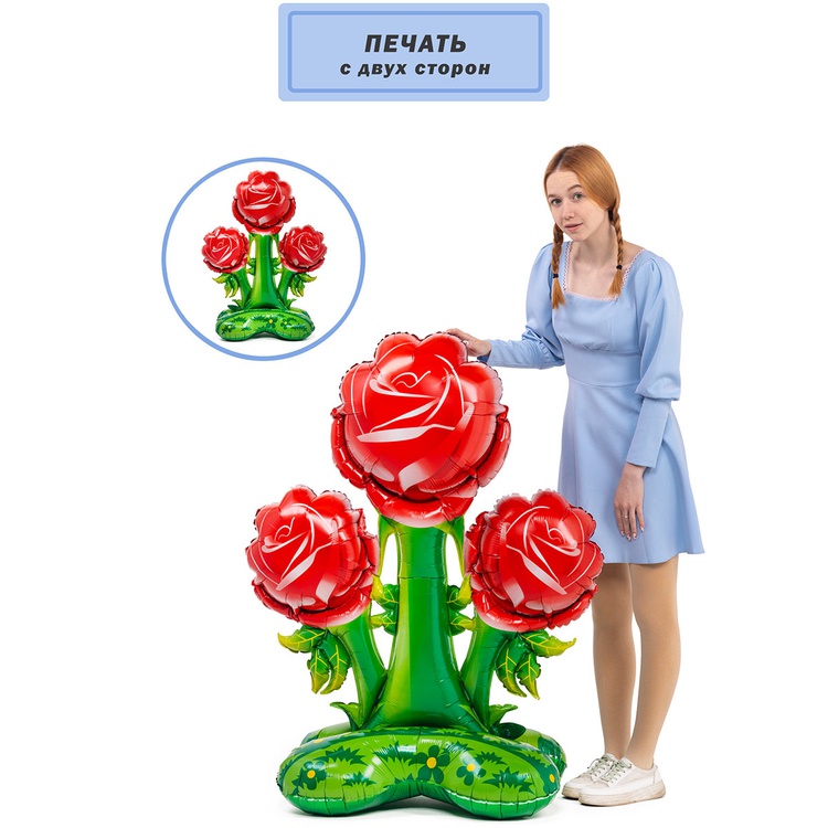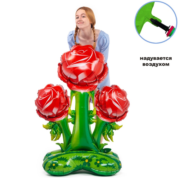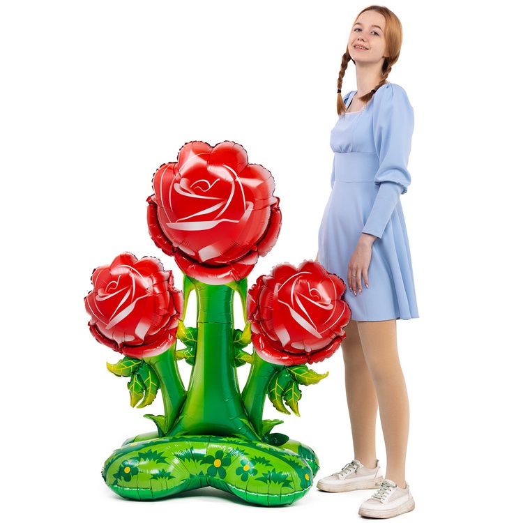 Объемный фольгированный шар высотой 132 см в форме трех больших красных роз. Данный шар представляет собой цельную фольгированную фигуру, которая надувается полностью через один клапан, находящийся сбоку, вместе с основной частью сразу же надуется и нижняя часть в виде подставки. Такую фигуру можно использовать как самостоятельную декорацию для любого праздника.Шар надувается ВОЗДУХОМ.