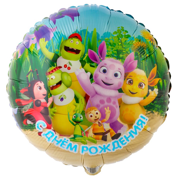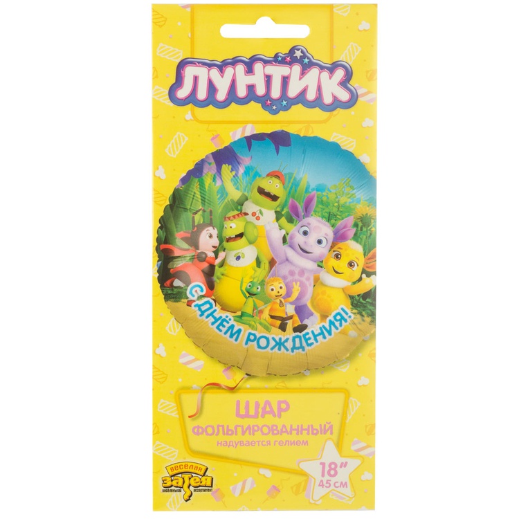 Фольгированный воздушный шар с изображением любимых героев мультфильма Лунтик. Изготовлен из тонкой миларовой пленки, которая хорошо удерживает гелий в течение нескольких дней. Имеет встроенный клапан. Поэтому плотно надутый шар завязывать не требуется - обратный клапан удерживает гелий внутри шара. Ленту к шару привязывают только для того, чтобы шар не улетел.Шар можно надуть воздухом, но если вы хотите, чтобы шар летал его необходимо наполнить гелием.