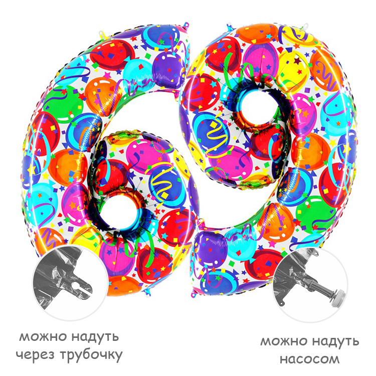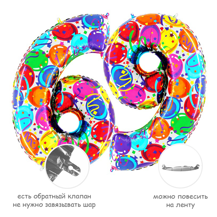 Фольгированный воздушный шар в форме цифры. Изготовлен из тонкой миларовой пленки, позволяющей шару не сдуваться в течение нескольких дней.Фольгированные воздушные шары надувают через клапан. Поэтому плотно надутый шар завязывать не требуется - обратный клапан хорошо удерживает гелий внутри шара. К шару привязывают ленту только для того, чтобы шар не улетел.